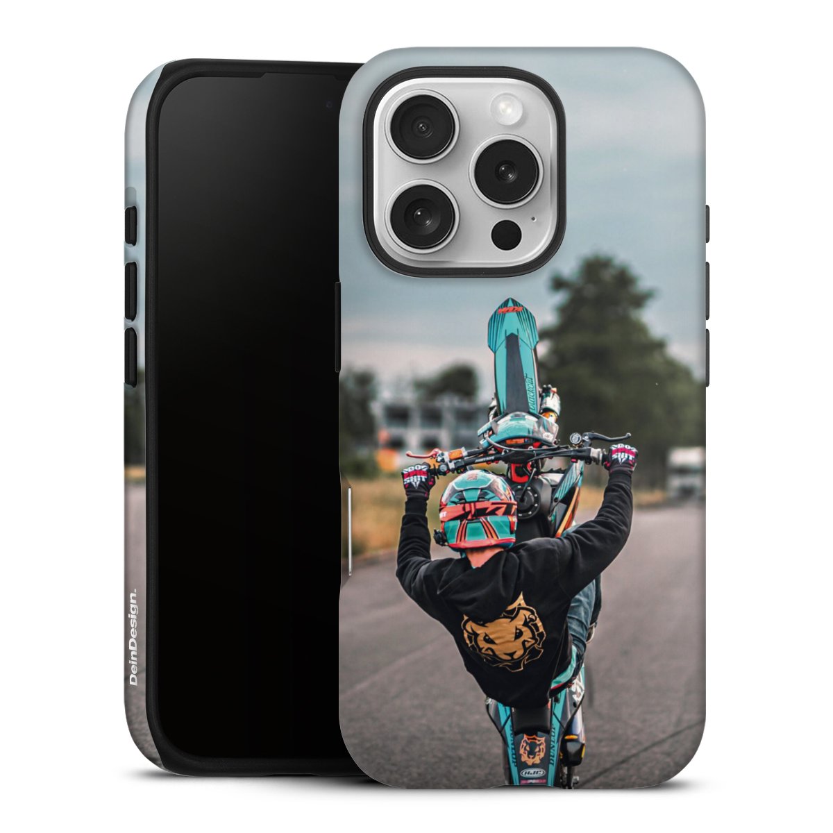 Bei dieser Handyhülle nutzen wird den besonders langlebigen Sublimationsdruck. Dieses raffinierte Druckverfahren sticht durch sein hochwertiges, gestochen scharfes Druckbild in brillanten Farben hervor. Der Druckbereich umfasst die ganze Hartschale inklusive der Ecken und Kanten, lediglich der Silikon-Einleger bleibt einfarbig schwarz. Wähle für Dein Design entweder eines unserer exklusiven Shop-Motive, oder werde kreativ und gestalte Dein Wunschdesign zum Beispiel mit Fotos und Overlays selbst.