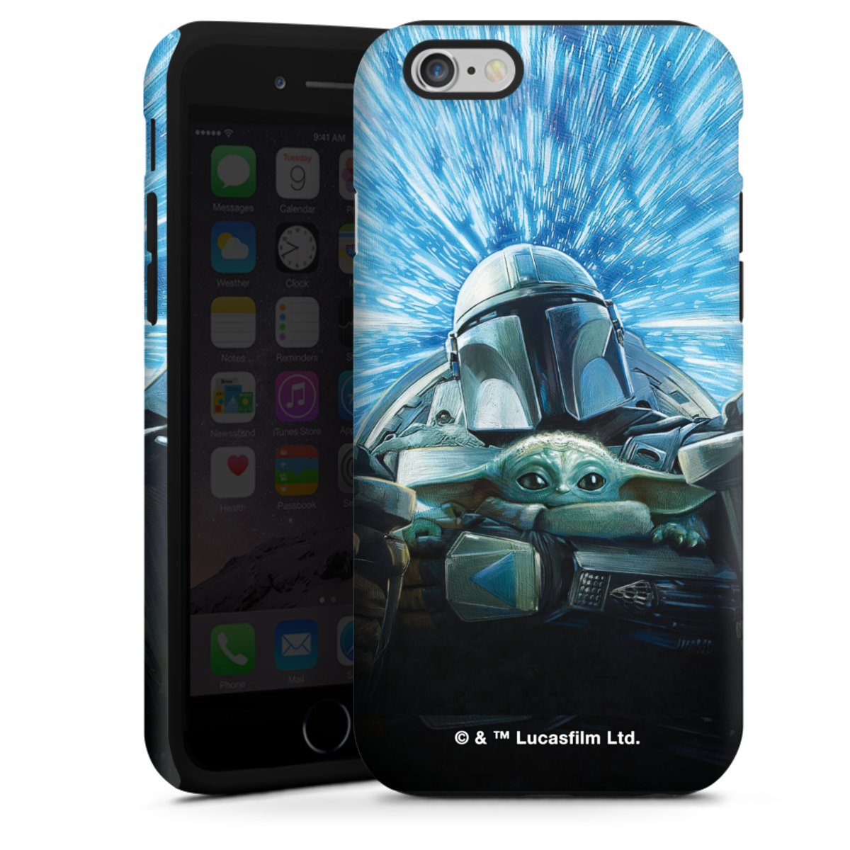 Grogu und Mando fliegen blau