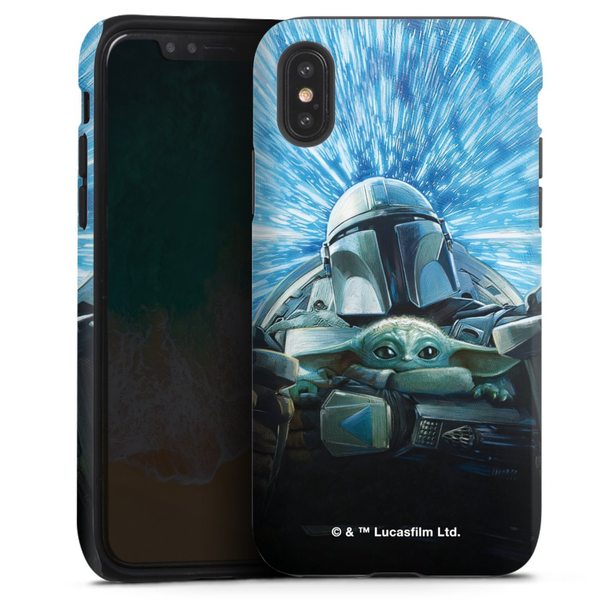 Grogu und Mando fliegen blau
