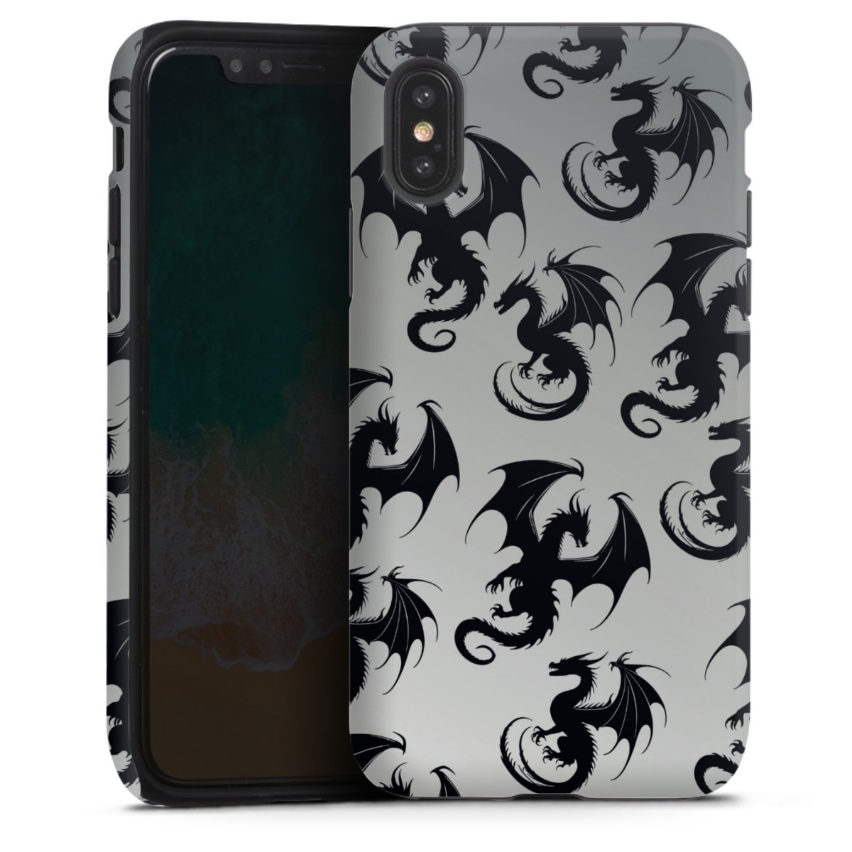 Bei dieser Handyhülle nutzen wird den besonders langlebigen Sublimationsdruck. Dieses raffinierte Druckverfahren sticht durch sein hochwertiges, gestochen scharfes Druckbild in brillanten Farben hervor. Der Druckbereich umfasst die ganze Hartschale inklusive der Ecken und Kanten, lediglich der Silikon-Einleger bleibt einfarbig schwarz. Wähle für Dein Design entweder eines unserer exklusiven Shop-Motive, oder werde kreativ und gestalte Dein Wunschdesign zum Beispiel mit Fotos und Overlays selbst.