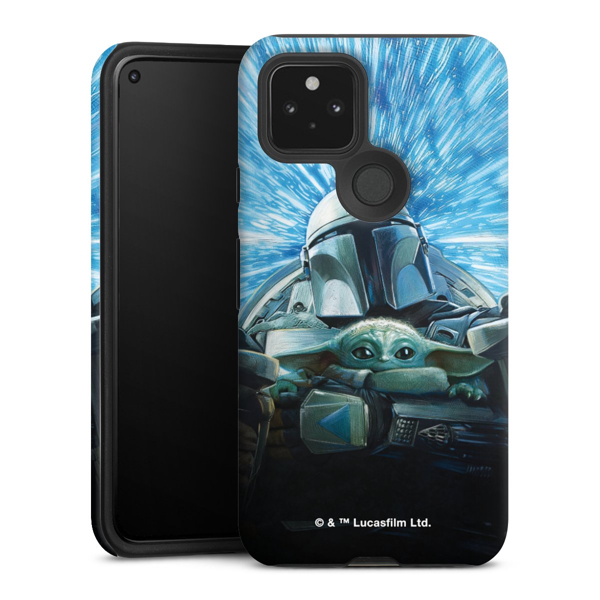 Grogu und Mando fliegen blau