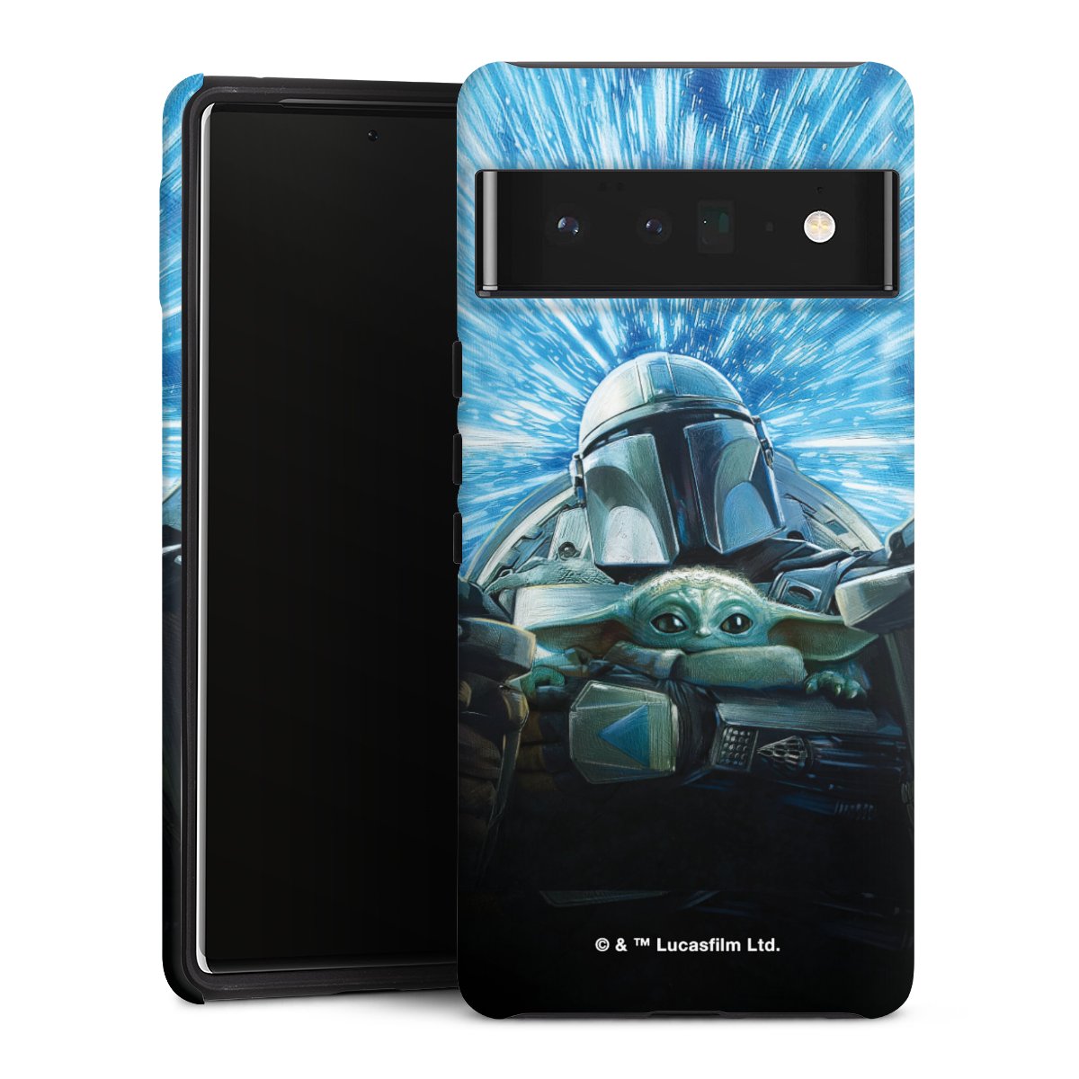 Grogu und Mando fliegen blau