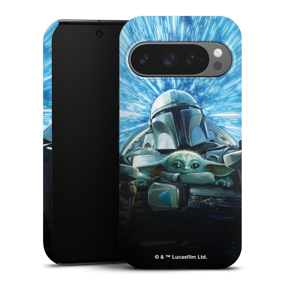 Grogu und Mando fliegen blau