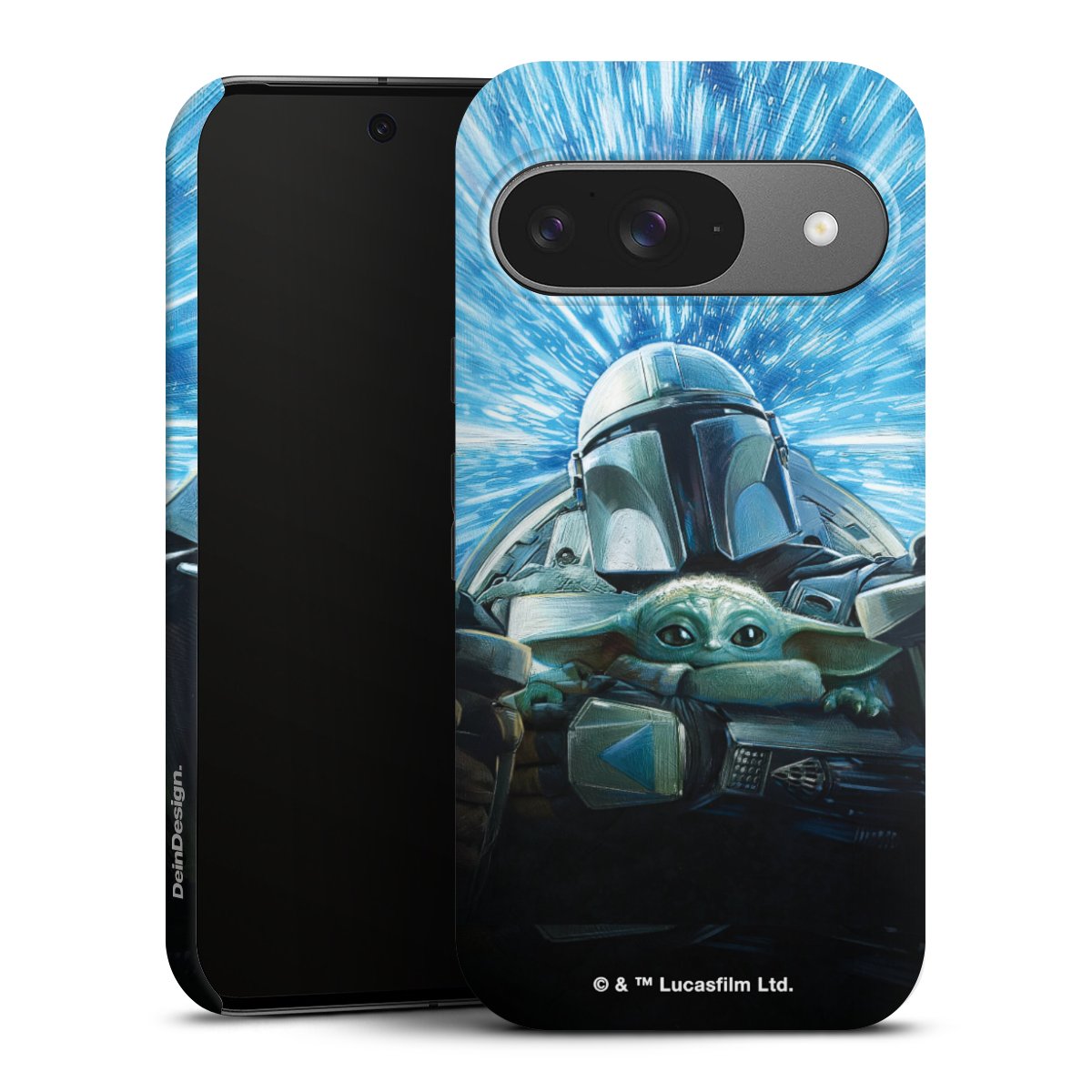 Grogu und Mando fliegen blau