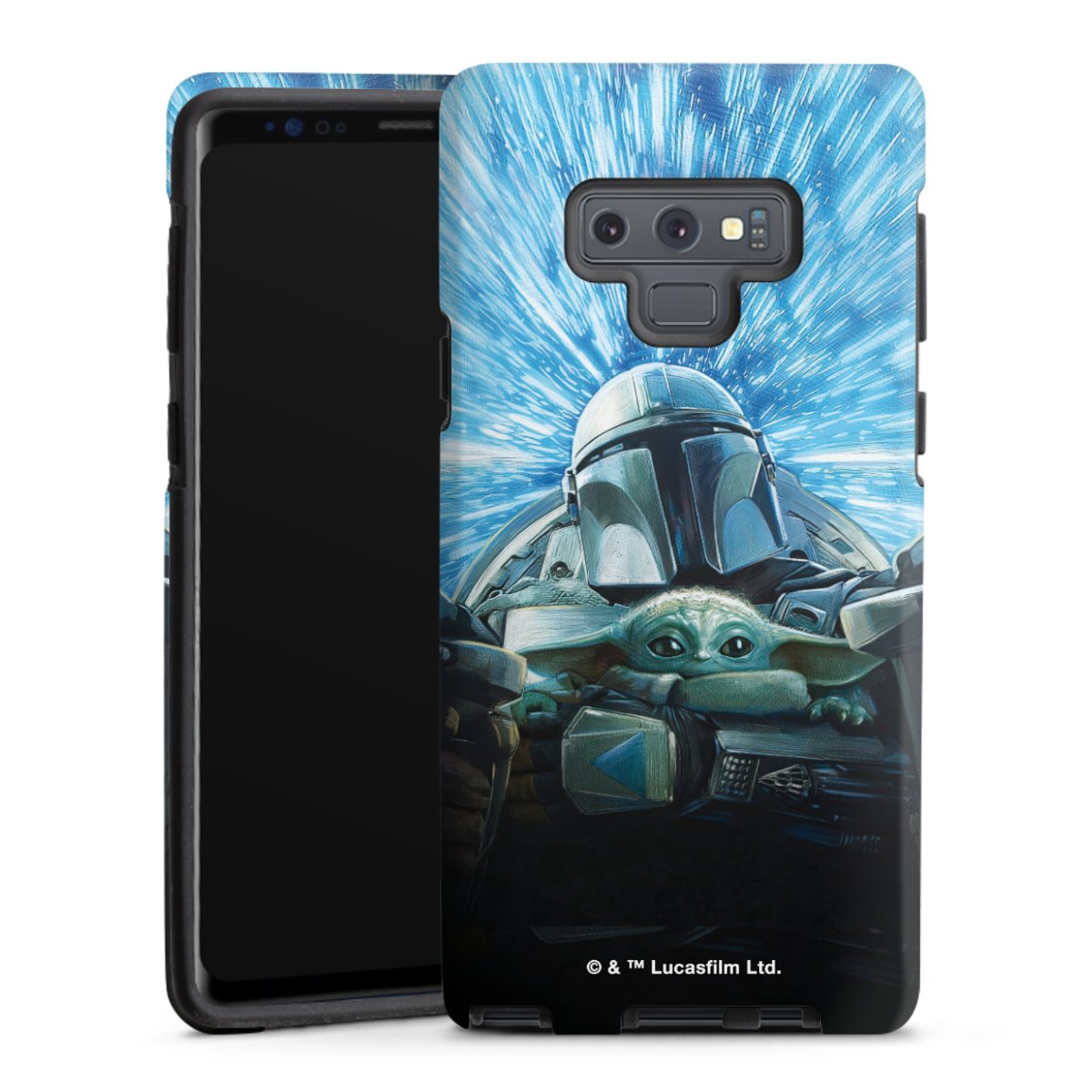 Grogu und Mando fliegen blau