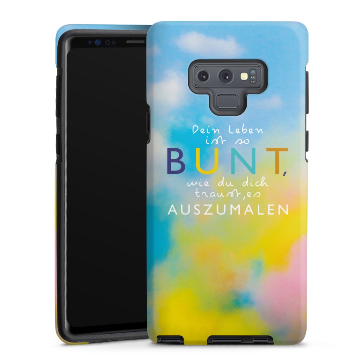 Bei dieser Handyhülle nutzen wird den besonders langlebigen Sublimationsdruck. Dieses raffinierte Druckverfahren sticht durch sein hochwertiges, gestochen scharfes Druckbild in brillanten Farben hervor. Der Druckbereich umfasst die ganze Hartschale inklusive der Ecken und Kanten, lediglich der Silikon-Einleger bleibt einfarbig schwarz. Wähle für Dein Design entweder eines unserer exklusiven Shop-Motive, oder werde kreativ und gestalte Dein Wunschdesign zum Beispiel mit Fotos und Overlays selbst.