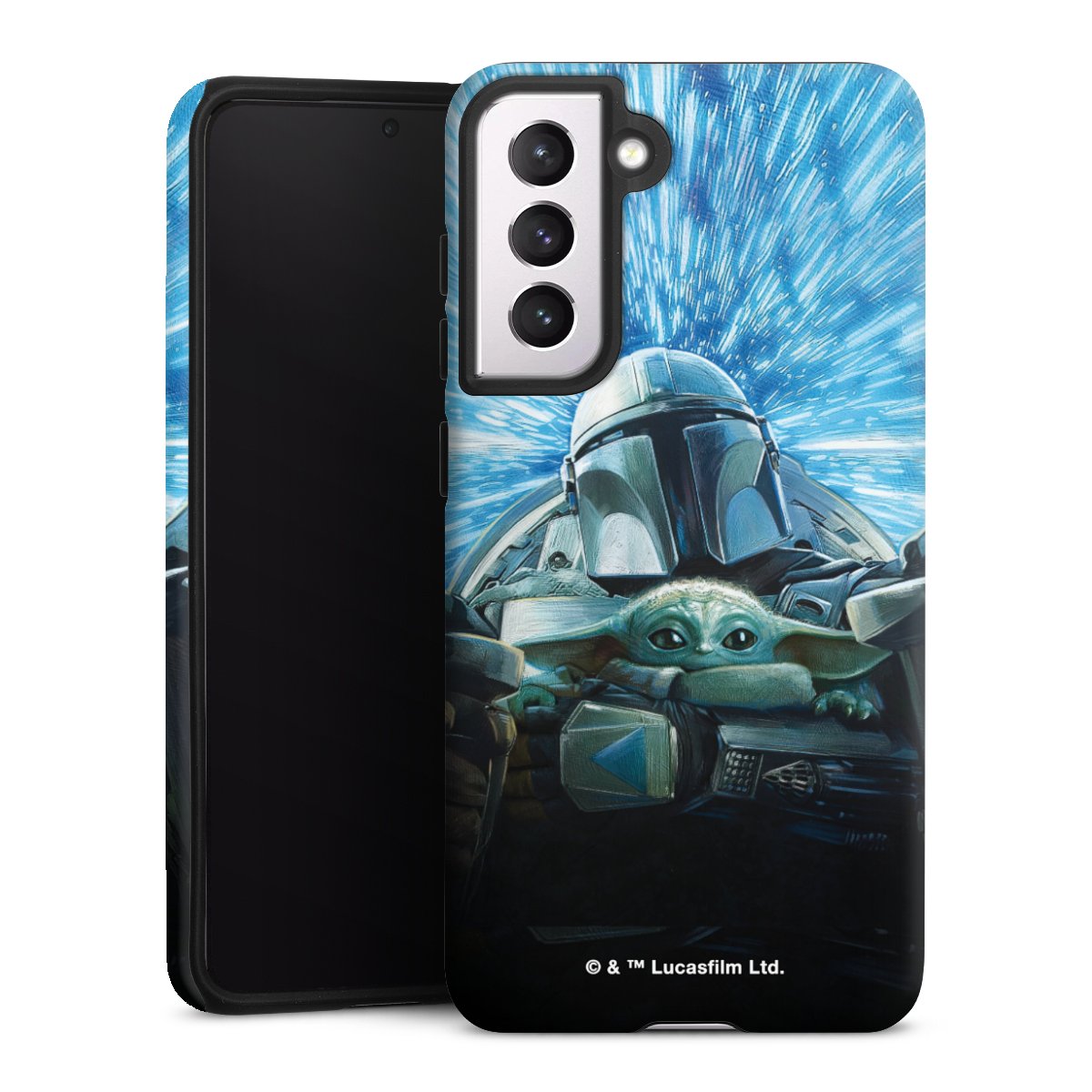Grogu und Mando fliegen blau