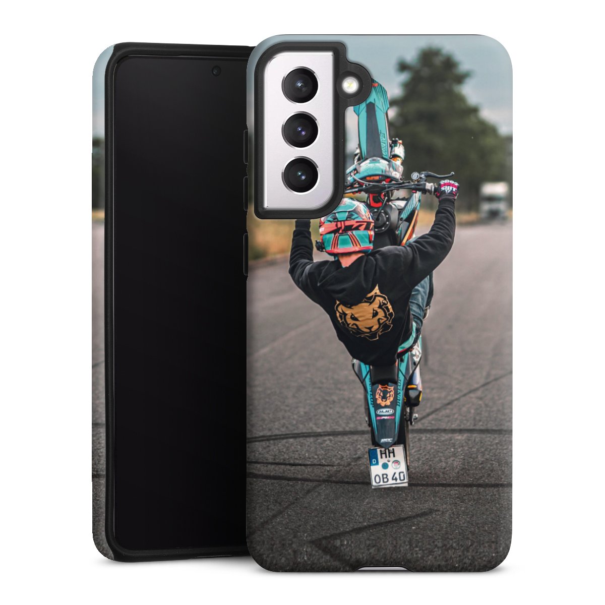 Bei dieser Handyhülle nutzen wird den besonders langlebigen Sublimationsdruck. Dieses raffinierte Druckverfahren sticht durch sein hochwertiges, gestochen scharfes Druckbild in brillanten Farben hervor. Der Druckbereich umfasst die ganze Hartschale inklusive der Ecken und Kanten, lediglich der Silikon-Einleger bleibt einfarbig schwarz. Wähle für Dein Design entweder eines unserer exklusiven Shop-Motive, oder werde kreativ und gestalte Dein Wunschdesign zum Beispiel mit Fotos und Overlays selbst.