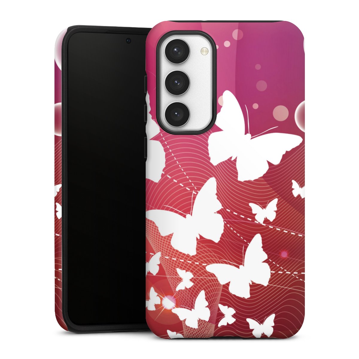 Bei dieser Handyhülle nutzen wird den besonders langlebigen Sublimationsdruck. Dieses raffinierte Druckverfahren sticht durch sein hochwertiges, gestochen scharfes Druckbild in brillanten Farben hervor. Der Druckbereich umfasst die ganze Hartschale inklusive der Ecken und Kanten, lediglich der Silikon-Einleger bleibt einfarbig schwarz. Wähle für Dein Design entweder eines unserer exklusiven Shop-Motive, oder werde kreativ und gestalte Dein Wunschdesign zum Beispiel mit Fotos und Overlays selbst.