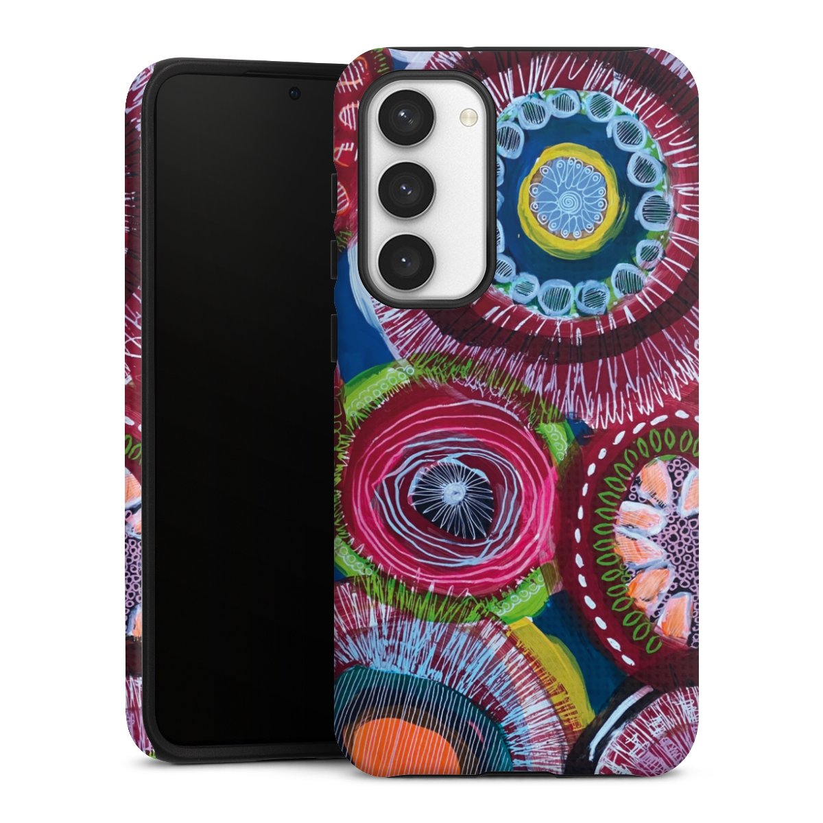 Bei dieser Handyhülle nutzen wird den besonders langlebigen Sublimationsdruck. Dieses raffinierte Druckverfahren sticht durch sein hochwertiges, gestochen scharfes Druckbild in brillanten Farben hervor. Der Druckbereich umfasst die ganze Hartschale inklusive der Ecken und Kanten, lediglich der Silikon-Einleger bleibt einfarbig schwarz. Wähle für Dein Design entweder eines unserer exklusiven Shop-Motive, oder werde kreativ und gestalte Dein Wunschdesign zum Beispiel mit Fotos und Overlays selbst.