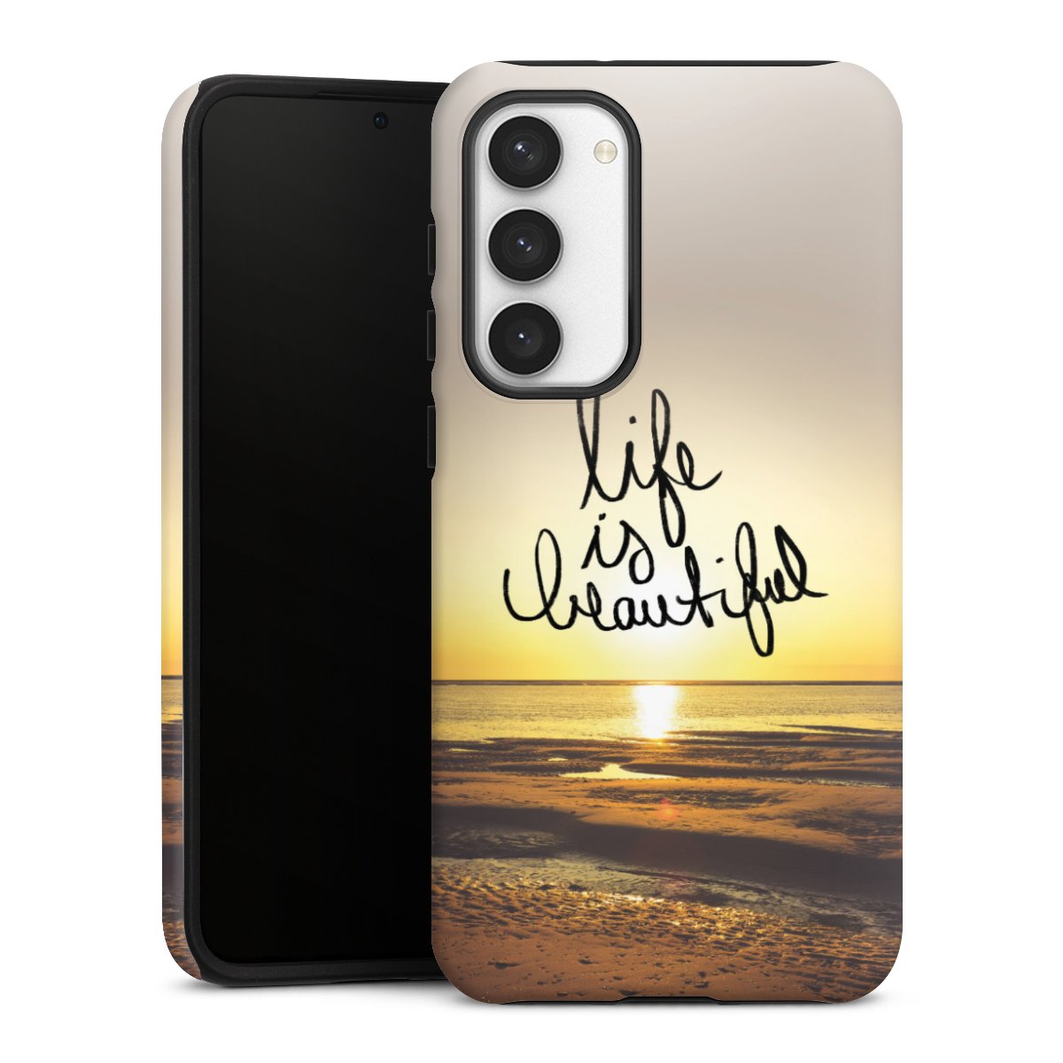Bei dieser Handyhülle nutzen wird den besonders langlebigen Sublimationsdruck. Dieses raffinierte Druckverfahren sticht durch sein hochwertiges, gestochen scharfes Druckbild in brillanten Farben hervor. Der Druckbereich umfasst die ganze Hartschale inklusive der Ecken und Kanten, lediglich der Silikon-Einleger bleibt einfarbig schwarz. Wähle für Dein Design entweder eines unserer exklusiven Shop-Motive, oder werde kreativ und gestalte Dein Wunschdesign zum Beispiel mit Fotos und Overlays selbst.