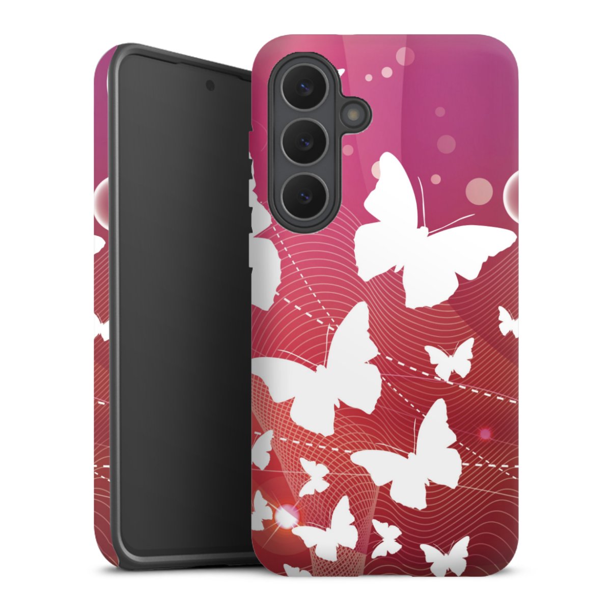 Bei dieser Handyhülle nutzen wird den besonders langlebigen Sublimationsdruck. Dieses raffinierte Druckverfahren sticht durch sein hochwertiges, gestochen scharfes Druckbild in brillanten Farben hervor. Der Druckbereich umfasst die ganze Hartschale inklusive der Ecken und Kanten, lediglich der Silikon-Einleger bleibt einfarbig schwarz. Wähle für Dein Design entweder eines unserer exklusiven Shop-Motive, oder werde kreativ und gestalte Dein Wunschdesign zum Beispiel mit Fotos und Overlays selbst.