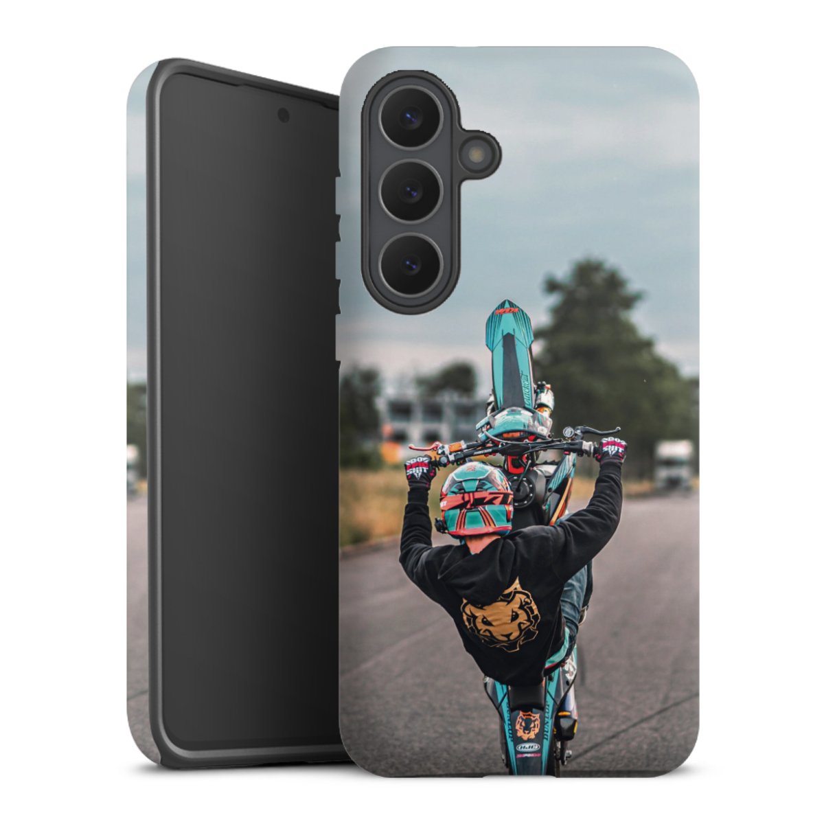 Bei dieser Handyhülle nutzen wird den besonders langlebigen Sublimationsdruck. Dieses raffinierte Druckverfahren sticht durch sein hochwertiges, gestochen scharfes Druckbild in brillanten Farben hervor. Der Druckbereich umfasst die ganze Hartschale inklusive der Ecken und Kanten, lediglich der Silikon-Einleger bleibt einfarbig schwarz. Wähle für Dein Design entweder eines unserer exklusiven Shop-Motive, oder werde kreativ und gestalte Dein Wunschdesign zum Beispiel mit Fotos und Overlays selbst.