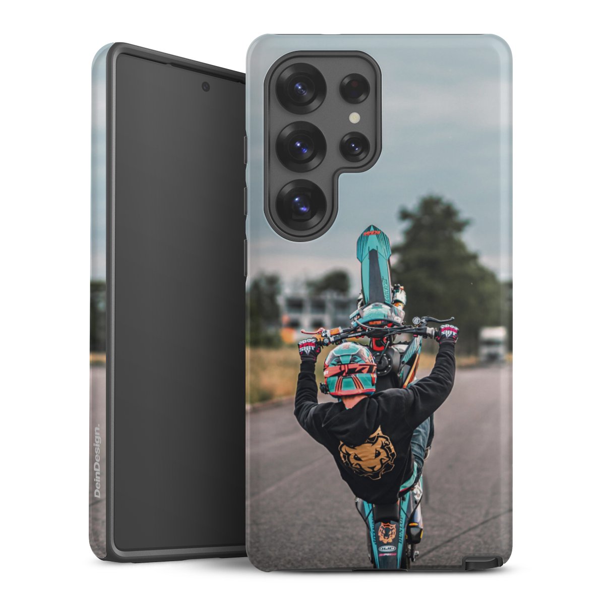 Bei dieser Handyhülle nutzen wird den besonders langlebigen Sublimationsdruck. Dieses raffinierte Druckverfahren sticht durch sein hochwertiges, gestochen scharfes Druckbild in brillanten Farben hervor. Der Druckbereich umfasst die ganze Hartschale inklusive der Ecken und Kanten, lediglich der Silikon-Einleger bleibt einfarbig schwarz. Wähle für Dein Design entweder eines unserer exklusiven Shop-Motive, oder werde kreativ und gestalte Dein Wunschdesign zum Beispiel mit Fotos und Overlays selbst.