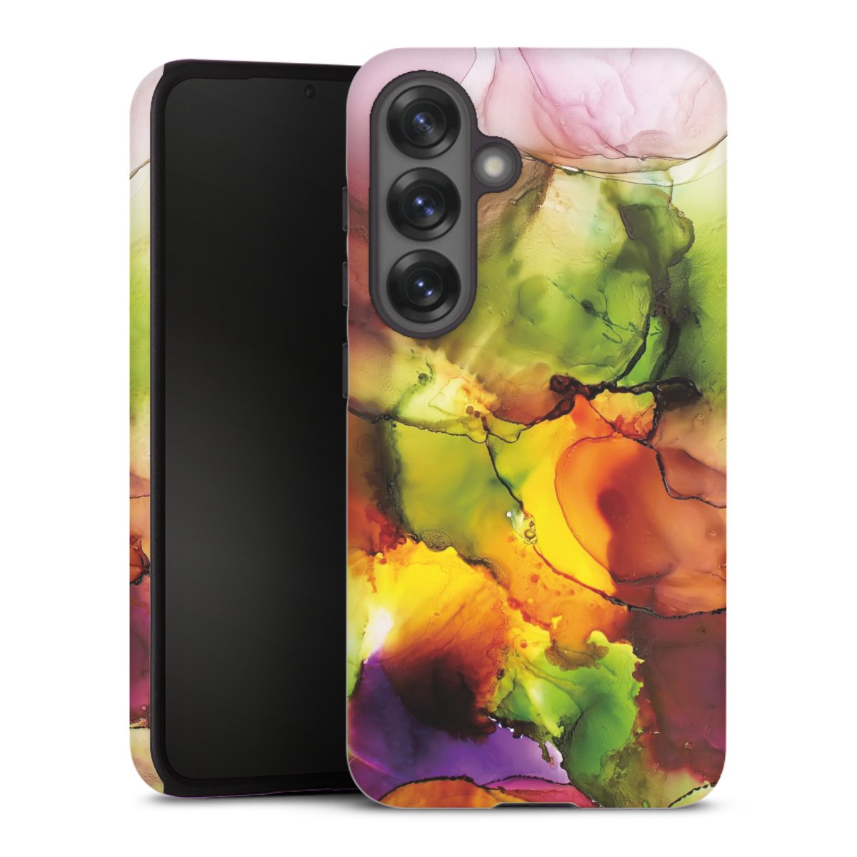 Bei dieser Handyhülle nutzen wird den besonders langlebigen Sublimationsdruck. Dieses raffinierte Druckverfahren sticht durch sein hochwertiges, gestochen scharfes Druckbild in brillanten Farben hervor. Der Druckbereich umfasst die ganze Hartschale inklusive der Ecken und Kanten, lediglich der Silikon-Einleger bleibt einfarbig schwarz. Wähle für Dein Design entweder eines unserer exklusiven Shop-Motive, oder werde kreativ und gestalte Dein Wunschdesign zum Beispiel mit Fotos und Overlays selbst.