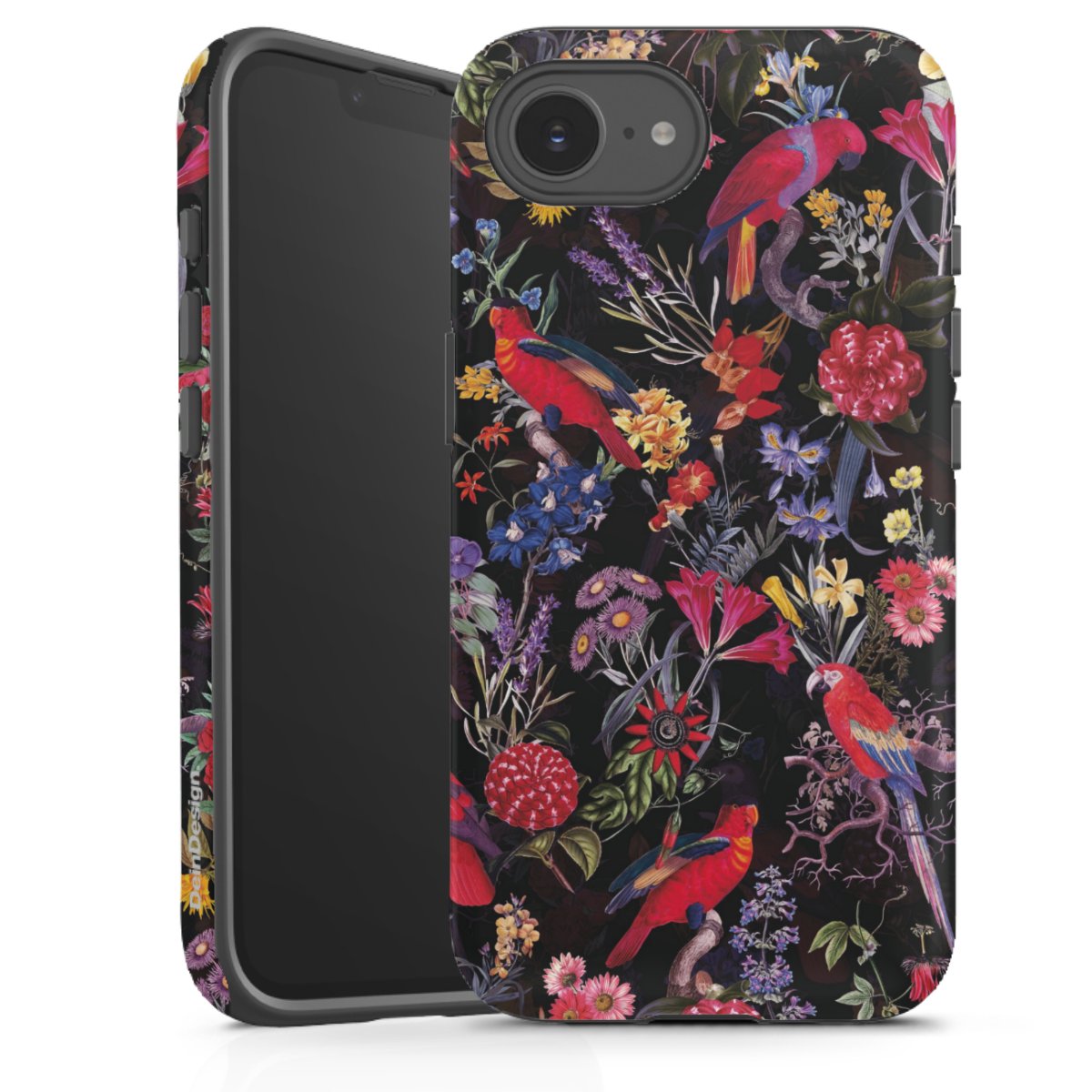 Dunkle Blumen und Papageien