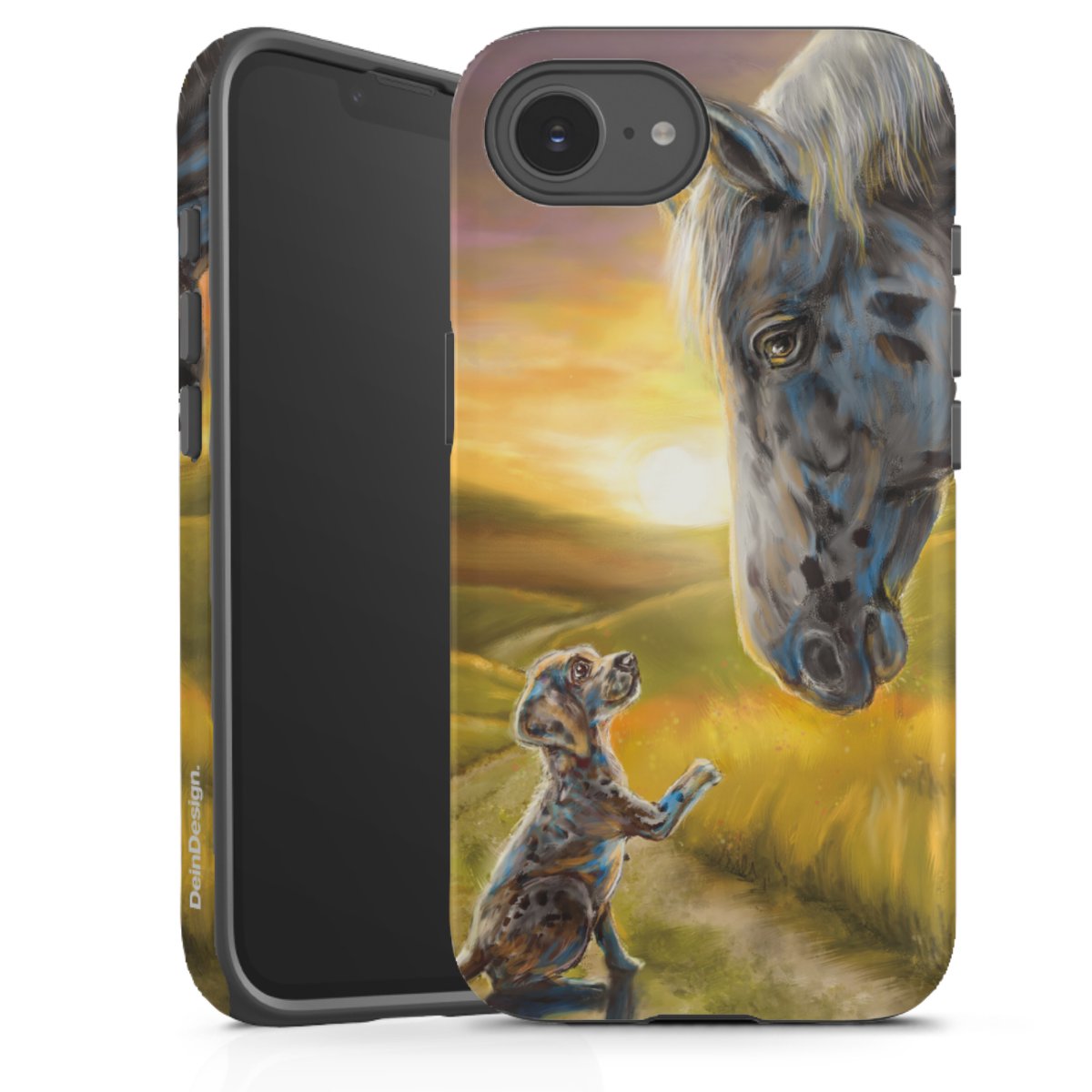 Bei dieser Handyhülle nutzen wird den besonders langlebigen Sublimationsdruck. Dieses raffinierte Druckverfahren sticht durch sein hochwertiges, gestochen scharfes Druckbild in brillanten Farben hervor. Der Druckbereich umfasst die ganze Hartschale inklusive der Ecken und Kanten, lediglich der Silikon-Einleger bleibt einfarbig schwarz. Wähle für Dein Design entweder eines unserer exklusiven Shop-Motive, oder werde kreativ und gestalte Dein Wunschdesign zum Beispiel mit Fotos und Overlays selbst.