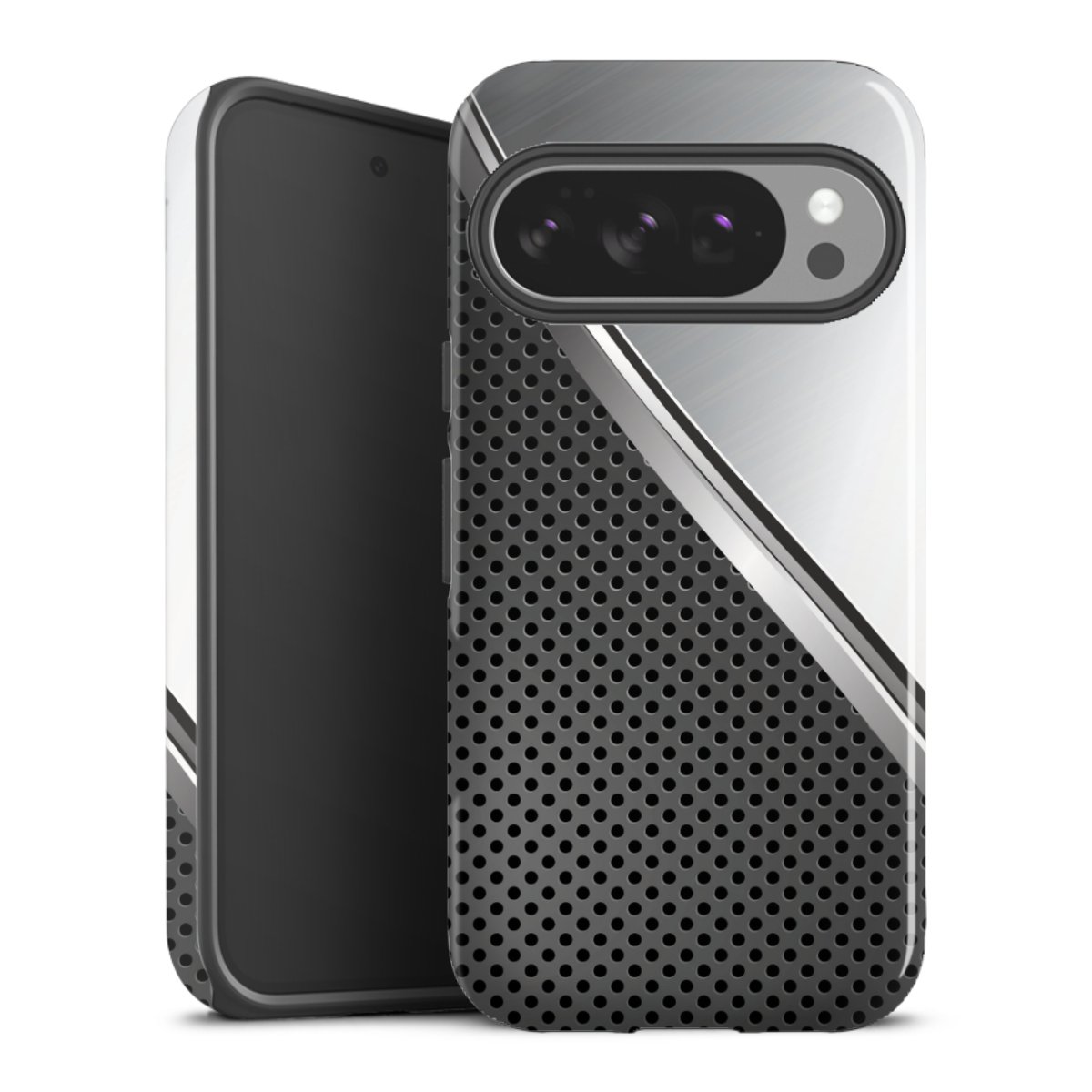 Unsere sicherste Schutzhülle vereint die Vorteile der Silikonhülle mit den Vorzügen des Premium Cases und besteht aus zwei Teilen: Innen federt der flexible Silikonkern aus robustem TPU (thermoplastisches Polyurethan) zuverlässig Stöße und Stürze ab, außen sorgt die widerstandsfähige und langlebige Hartschale aus Polycarbonat für zusätzliche Stabilität. Die Oberfläche der insgesamt 2,6 mm starken Hülle fühlt sich angenehm glatt an und macht das Tough Case zu einem echten Handschmeichler. Die Handyhülle ist in glänzend und matt erhältlich, der Silikoneinleger ist Schwarz.