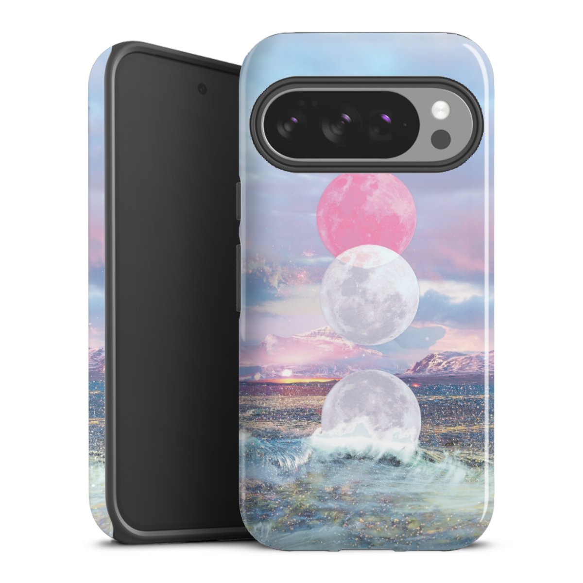 Bei dieser Handyhülle nutzen wird den besonders langlebigen Sublimationsdruck. Dieses raffinierte Druckverfahren sticht durch sein hochwertiges, gestochen scharfes Druckbild in brillanten Farben hervor. Der Druckbereich umfasst die ganze Hartschale inklusive der Ecken und Kanten, lediglich der Silikon-Einleger bleibt einfarbig schwarz. Wähle für Dein Design entweder eines unserer exklusiven Shop-Motive, oder werde kreativ und gestalte Dein Wunschdesign zum Beispiel mit Fotos und Overlays selbst.