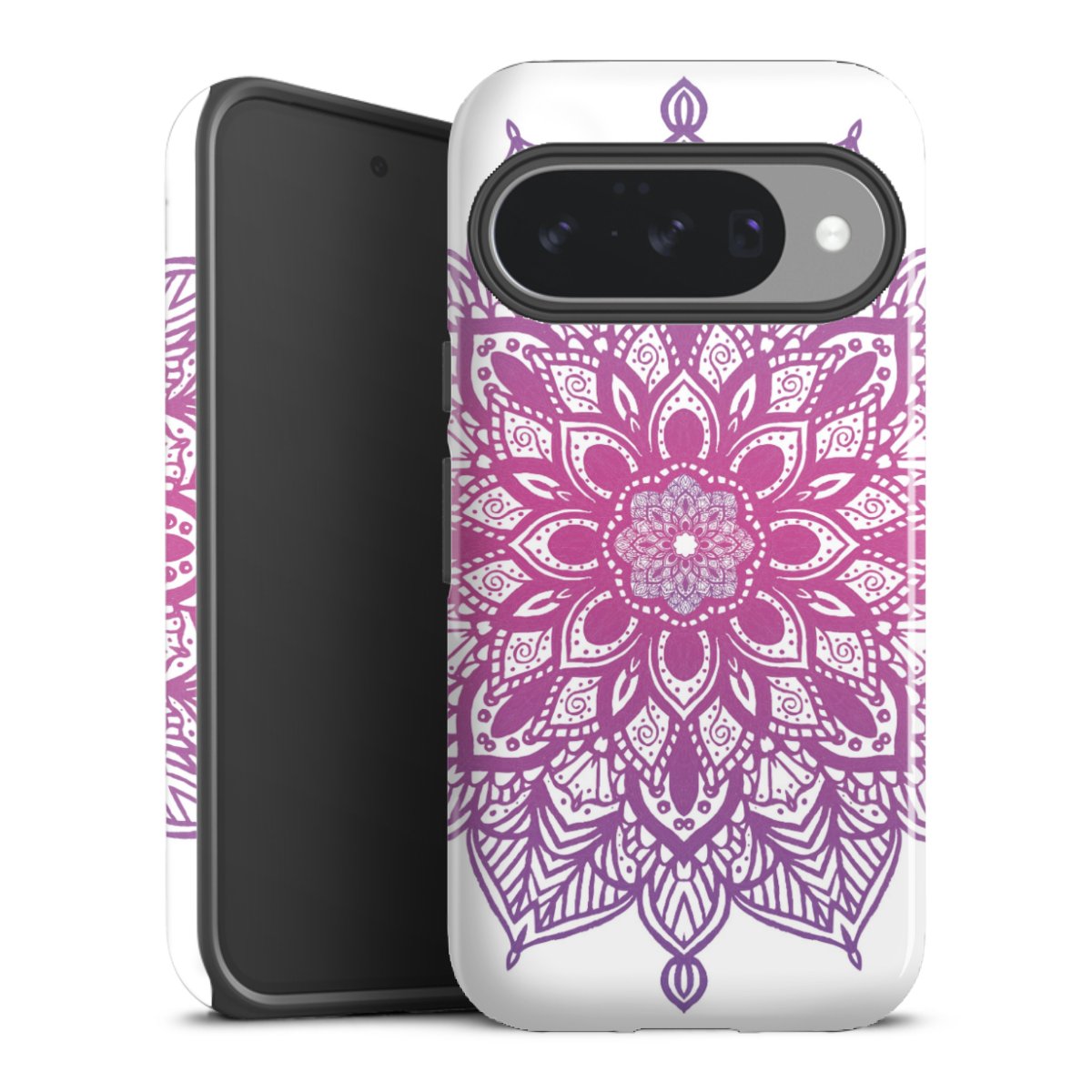 Bei dieser Handyhülle nutzen wird den besonders langlebigen Sublimationsdruck. Dieses raffinierte Druckverfahren sticht durch sein hochwertiges, gestochen scharfes Druckbild in brillanten Farben hervor. Der Druckbereich umfasst die ganze Hartschale inklusive der Ecken und Kanten, lediglich der Silikon-Einleger bleibt einfarbig schwarz. Wähle für Dein Design entweder eines unserer exklusiven Shop-Motive, oder werde kreativ und gestalte Dein Wunschdesign zum Beispiel mit Fotos und Overlays selbst.