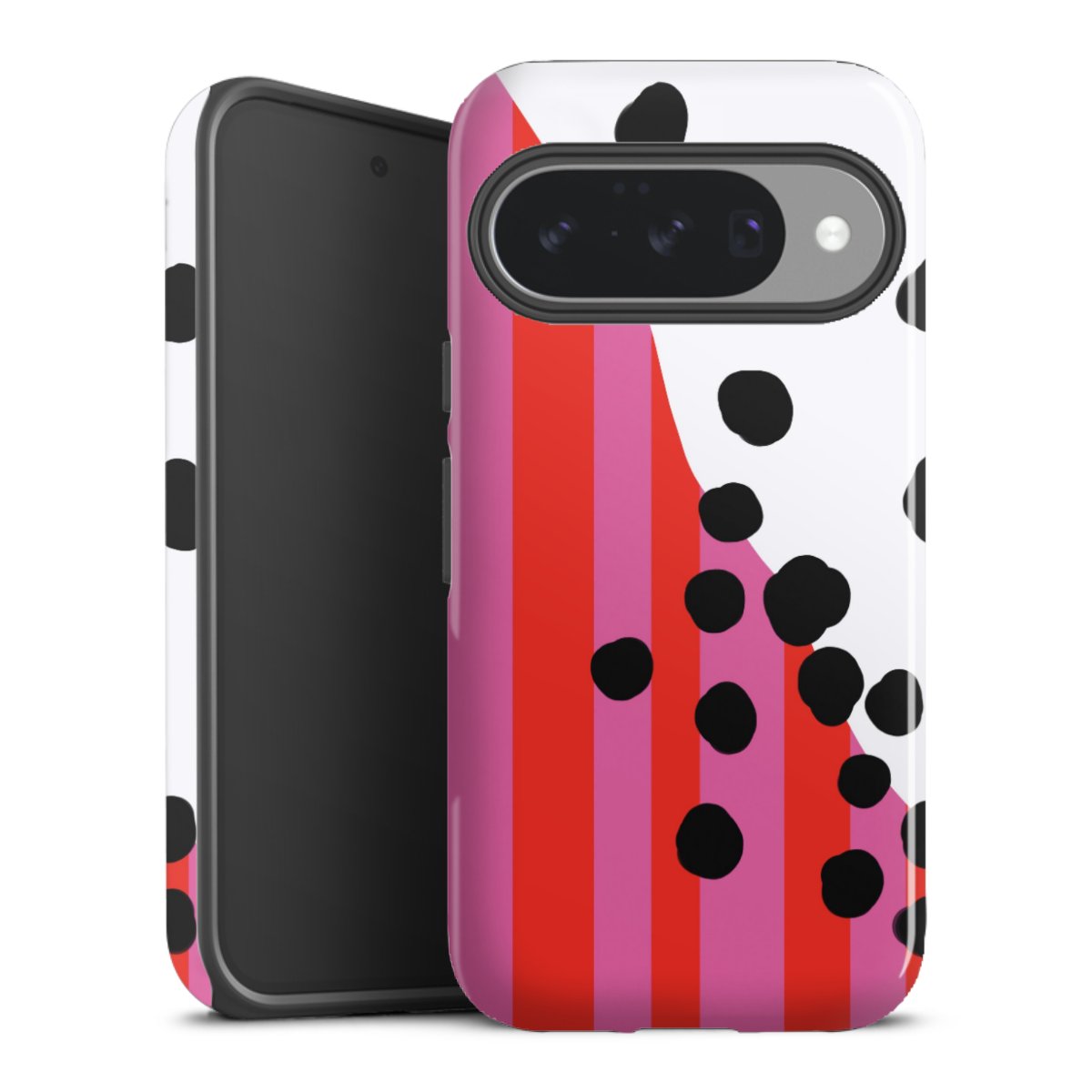 Bei dieser Handyhülle nutzen wird den besonders langlebigen Sublimationsdruck. Dieses raffinierte Druckverfahren sticht durch sein hochwertiges, gestochen scharfes Druckbild in brillanten Farben hervor. Der Druckbereich umfasst die ganze Hartschale inklusive der Ecken und Kanten, lediglich der Silikon-Einleger bleibt einfarbig schwarz. Wähle für Dein Design entweder eines unserer exklusiven Shop-Motive, oder werde kreativ und gestalte Dein Wunschdesign zum Beispiel mit Fotos und Overlays selbst.
