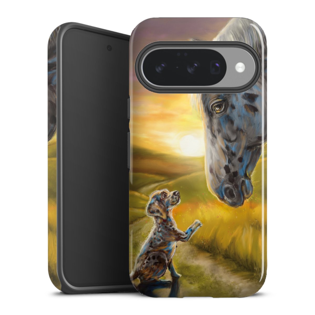 Bei dieser Handyhülle nutzen wird den besonders langlebigen Sublimationsdruck. Dieses raffinierte Druckverfahren sticht durch sein hochwertiges, gestochen scharfes Druckbild in brillanten Farben hervor. Der Druckbereich umfasst die ganze Hartschale inklusive der Ecken und Kanten, lediglich der Silikon-Einleger bleibt einfarbig schwarz. Wähle für Dein Design entweder eines unserer exklusiven Shop-Motive, oder werde kreativ und gestalte Dein Wunschdesign zum Beispiel mit Fotos und Overlays selbst.