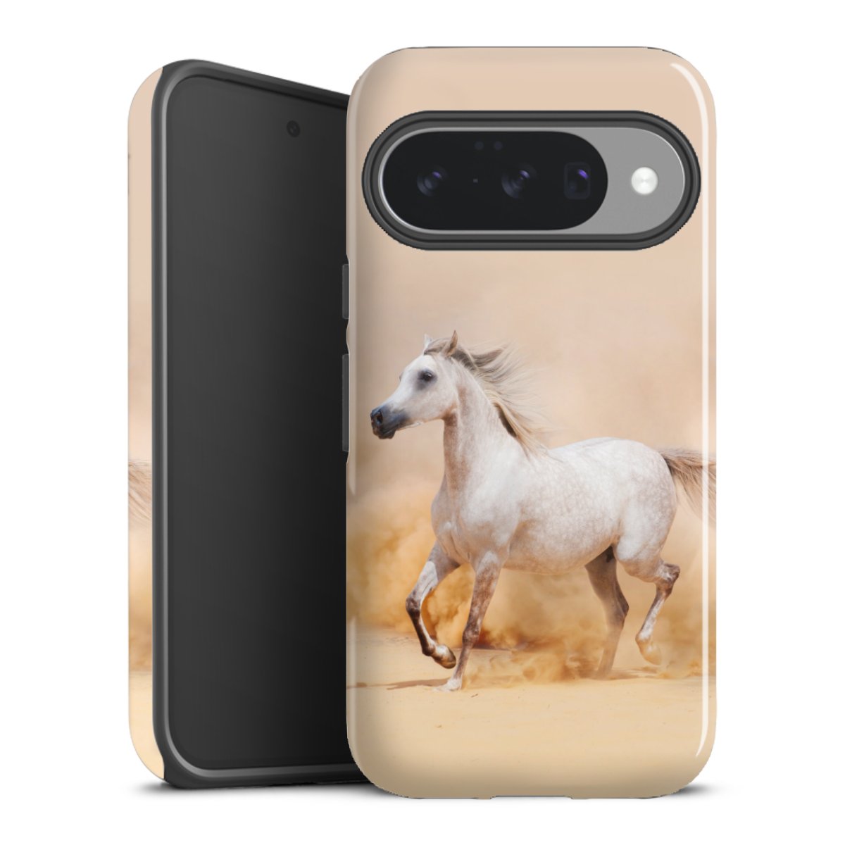 Bei dieser Handyhülle nutzen wird den besonders langlebigen Sublimationsdruck. Dieses raffinierte Druckverfahren sticht durch sein hochwertiges, gestochen scharfes Druckbild in brillanten Farben hervor. Der Druckbereich umfasst die ganze Hartschale inklusive der Ecken und Kanten, lediglich der Silikon-Einleger bleibt einfarbig schwarz. Wähle für Dein Design entweder eines unserer exklusiven Shop-Motive, oder werde kreativ und gestalte Dein Wunschdesign zum Beispiel mit Fotos und Overlays selbst.