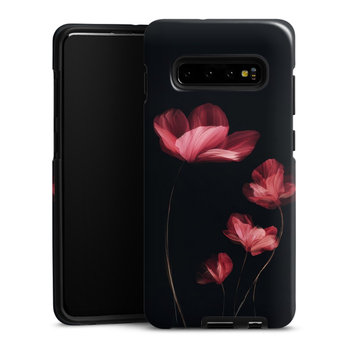 Bei dieser Handyhülle nutzen wird den besonders langlebigen Sublimationsdruck. Dieses raffinierte Druckverfahren sticht durch sein hochwertiges, gestochen scharfes Druckbild in brillanten Farben hervor. Der Druckbereich umfasst die ganze Hartschale inklusive der Ecken und Kanten, lediglich der Silikon-Einleger bleibt einfarbig schwarz. Wähle für Dein Design entweder eines unserer exklusiven Shop-Motive, oder werde kreativ und gestalte Dein Wunschdesign zum Beispiel mit Fotos und Overlays selbst.