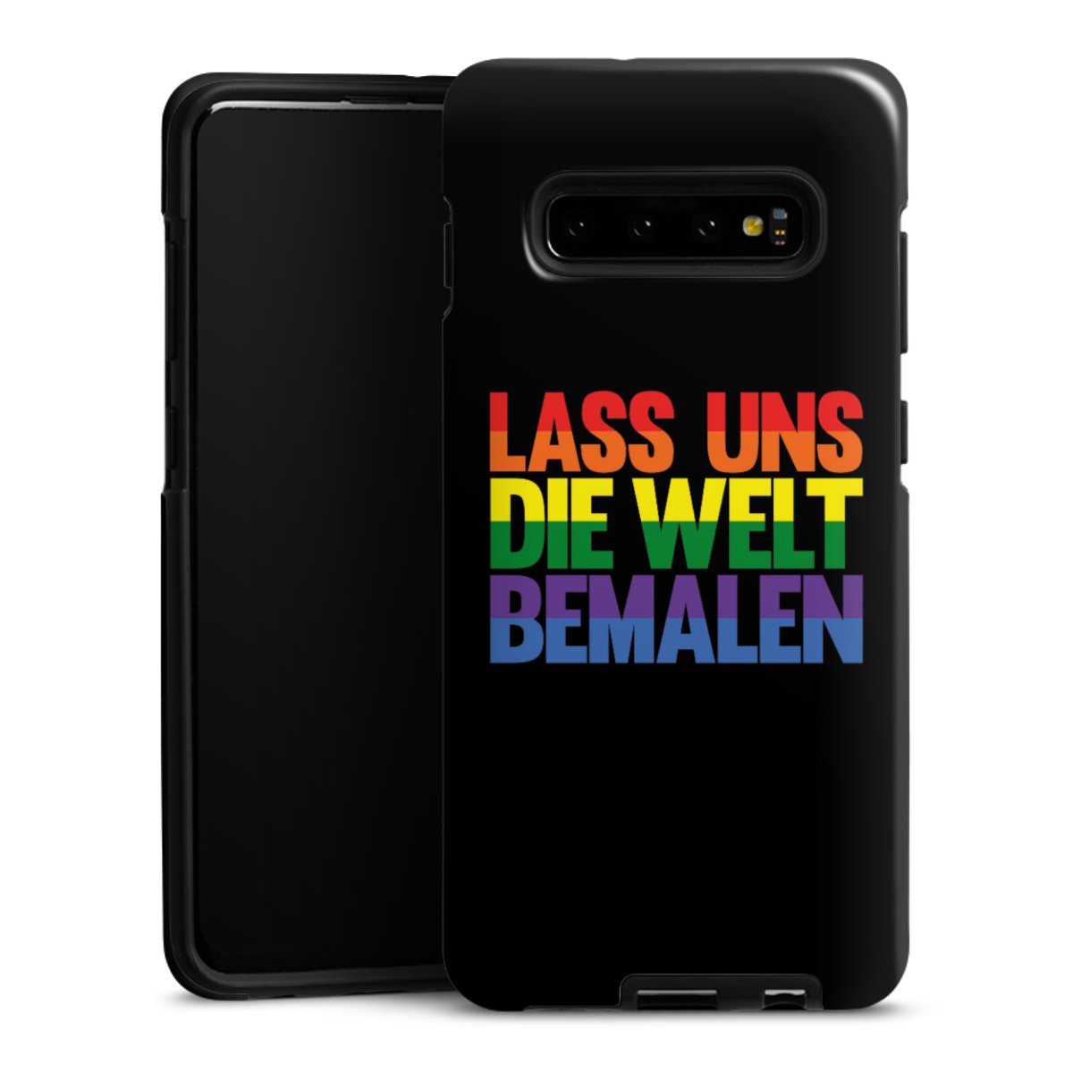 Bei dieser Handyhülle nutzen wird den besonders langlebigen Sublimationsdruck. Dieses raffinierte Druckverfahren sticht durch sein hochwertiges, gestochen scharfes Druckbild in brillanten Farben hervor. Der Druckbereich umfasst die ganze Hartschale inklusive der Ecken und Kanten, lediglich der Silikon-Einleger bleibt einfarbig schwarz. Wähle für Dein Design entweder eines unserer exklusiven Shop-Motive, oder werde kreativ und gestalte Dein Wunschdesign zum Beispiel mit Fotos und Overlays selbst.