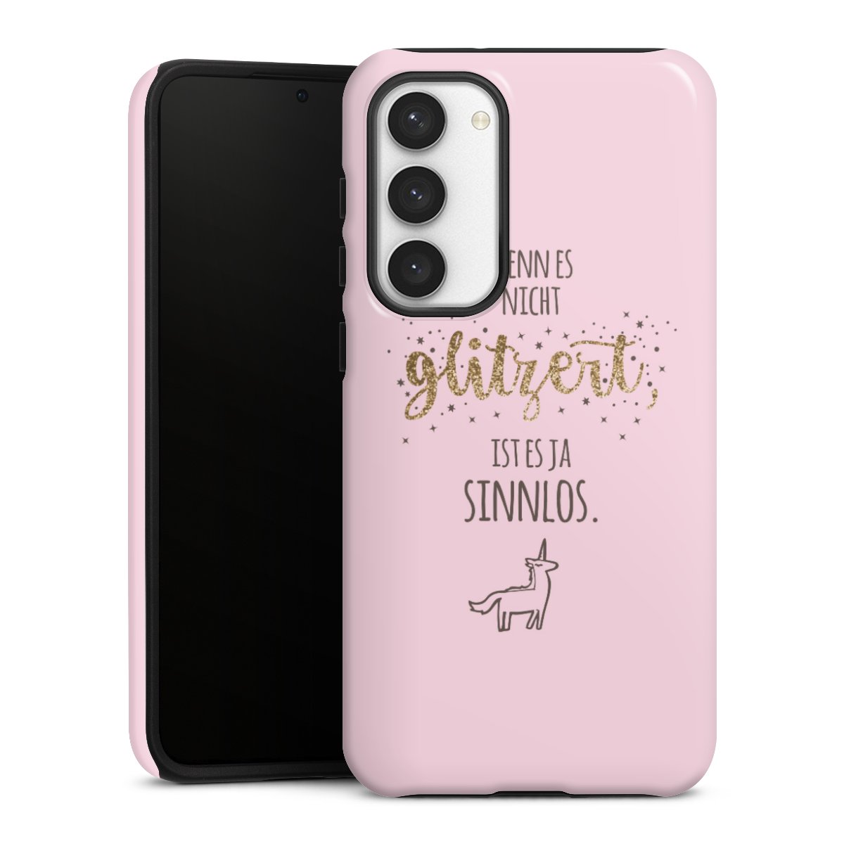 Bei dieser Handyhülle nutzen wird den besonders langlebigen Sublimationsdruck. Dieses raffinierte Druckverfahren sticht durch sein hochwertiges, gestochen scharfes Druckbild in brillanten Farben hervor. Der Druckbereich umfasst die ganze Hartschale inklusive der Ecken und Kanten, lediglich der Silikon-Einleger bleibt einfarbig schwarz. Wähle für Dein Design entweder eines unserer exklusiven Shop-Motive, oder werde kreativ und gestalte Dein Wunschdesign zum Beispiel mit Fotos und Overlays selbst.