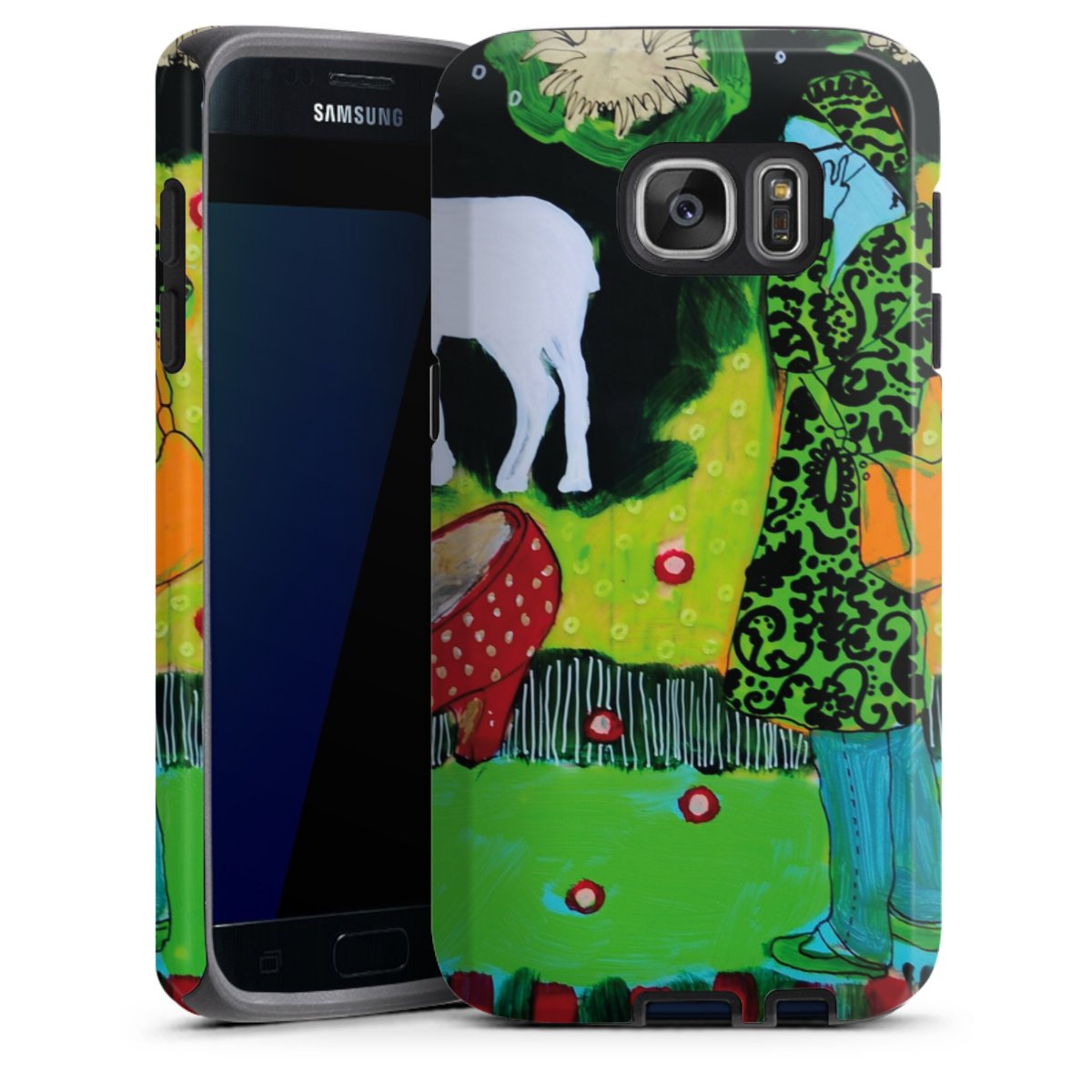 Bei dieser Handyhülle nutzen wird den besonders langlebigen Sublimationsdruck. Dieses raffinierte Druckverfahren sticht durch sein hochwertiges, gestochen scharfes Druckbild in brillanten Farben hervor. Der Druckbereich umfasst die ganze Hartschale inklusive der Ecken und Kanten, lediglich der Silikon-Einleger bleibt einfarbig schwarz. Wähle für Dein Design entweder eines unserer exklusiven Shop-Motive, oder werde kreativ und gestalte Dein Wunschdesign zum Beispiel mit Fotos und Overlays selbst.