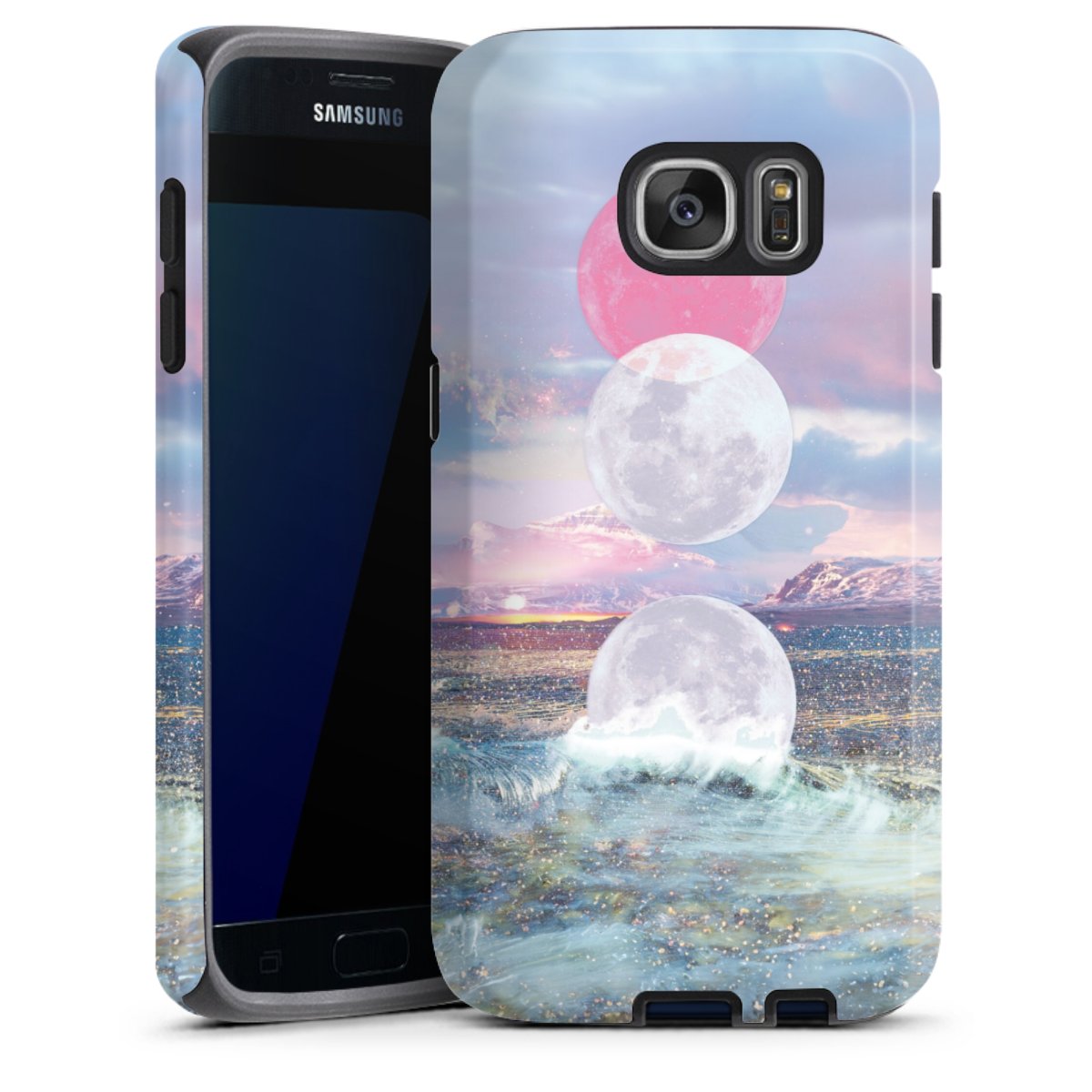 Bei dieser Handyhülle nutzen wird den besonders langlebigen Sublimationsdruck. Dieses raffinierte Druckverfahren sticht durch sein hochwertiges, gestochen scharfes Druckbild in brillanten Farben hervor. Der Druckbereich umfasst die ganze Hartschale inklusive der Ecken und Kanten, lediglich der Silikon-Einleger bleibt einfarbig schwarz. Wähle für Dein Design entweder eines unserer exklusiven Shop-Motive, oder werde kreativ und gestalte Dein Wunschdesign zum Beispiel mit Fotos und Overlays selbst.