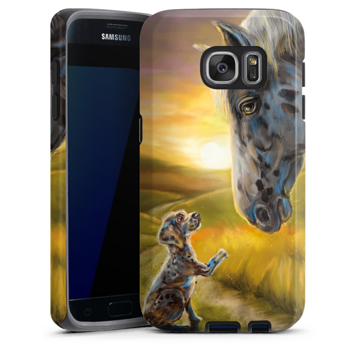 Bei dieser Handyhülle nutzen wird den besonders langlebigen Sublimationsdruck. Dieses raffinierte Druckverfahren sticht durch sein hochwertiges, gestochen scharfes Druckbild in brillanten Farben hervor. Der Druckbereich umfasst die ganze Hartschale inklusive der Ecken und Kanten, lediglich der Silikon-Einleger bleibt einfarbig schwarz. Wähle für Dein Design entweder eines unserer exklusiven Shop-Motive, oder werde kreativ und gestalte Dein Wunschdesign zum Beispiel mit Fotos und Overlays selbst.