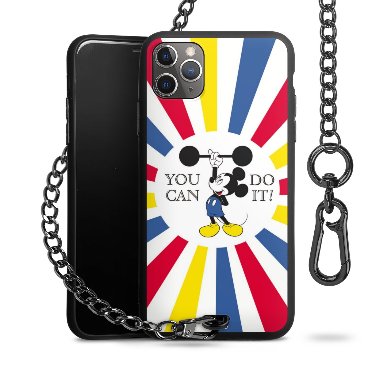 Die Handyhülle verfügt über eine mittig am unteren Rand platzierte Öse, an der die Metallkette stabil befestigt ist. Bestelle die Hülle einfach für Dein Smartphone-Modell, dann passt sie wie angegossen und Du brauchst sie bloß einmal anzudrücken. Handy in die Tasche, Karabiner an den Hosenbund – schon kann die Party starten.