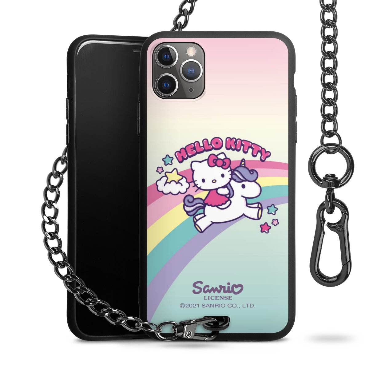 Die Handyhülle verfügt über eine mittig am unteren Rand platzierte Öse, an der die Metallkette stabil befestigt ist. Bestelle die Hülle einfach für Dein Smartphone-Modell, dann passt sie wie angegossen und Du brauchst sie bloß einmal anzudrücken. Handy in die Tasche, Karabiner an den Hosenbund – schon kann die Party starten.