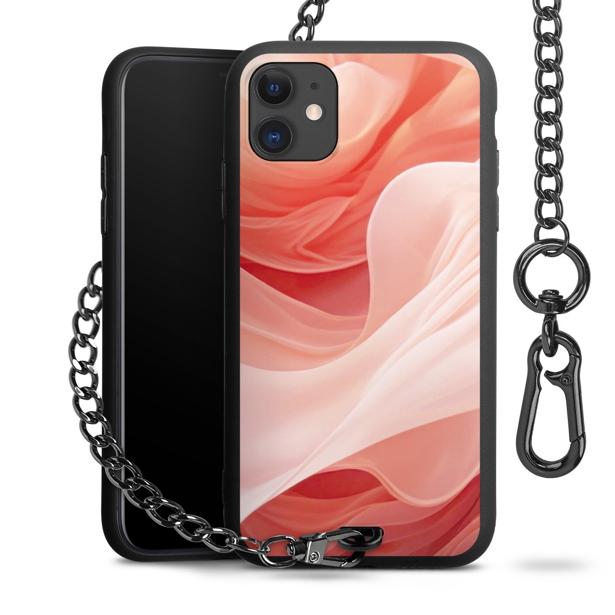 Die mattschwarze Silikon-Handyhülle besteht aus robustem TPU (thermoplastisches Polyurethan). Sie ist flexibel und schützt Dein Smartphone vor Stößen und Kratzern. Die Kette sowie der Karabinerhaken sind aus Metall in Gunmetal-Optik gefertigt. Für dieses Produkt kommen ausschließlich TÜV-geprüfte Materialien zum Einsatz.
