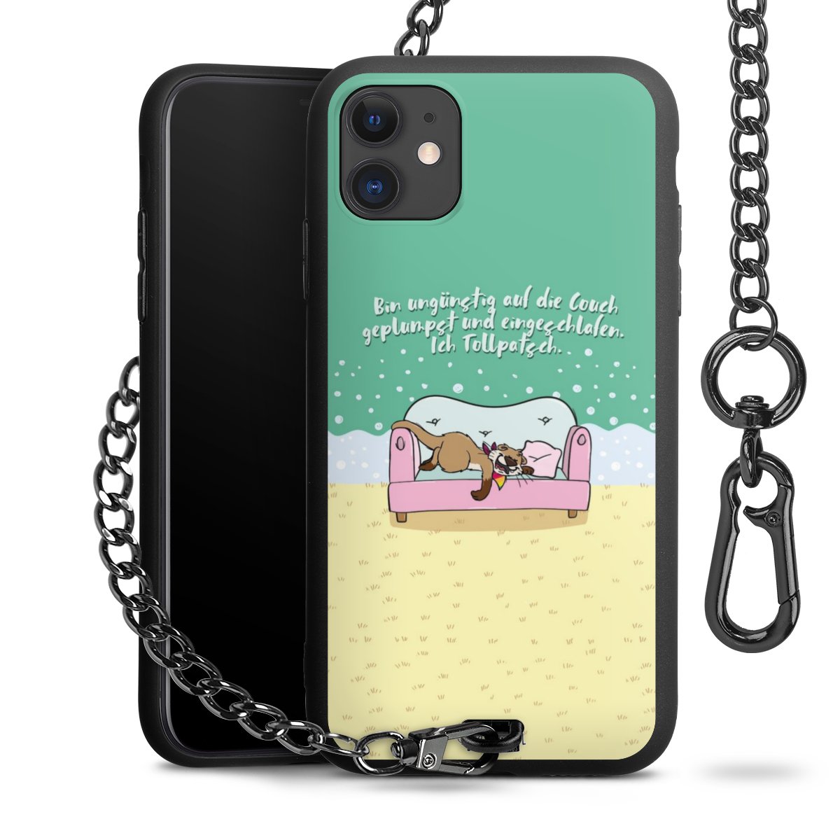 Die mattschwarze Silikon-Handyhülle besteht aus robustem TPU (thermoplastisches Polyurethan). Sie ist flexibel und schützt Dein Smartphone vor Stößen und Kratzern. Die Kette sowie der Karabinerhaken sind aus Metall in Gunmetal-Optik gefertigt. Für dieses Produkt kommen ausschließlich TÜV-geprüfte Materialien zum Einsatz.