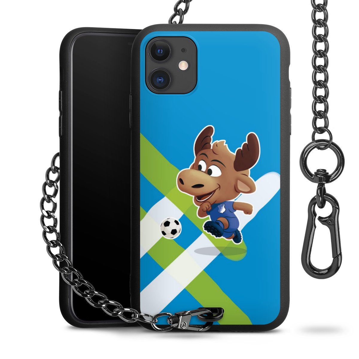 Die Handyhülle verfügt über eine mittig am unteren Rand platzierte Öse, an der die Metallkette stabil befestigt ist. Bestelle die Hülle einfach für Dein Smartphone-Modell, dann passt sie wie angegossen und Du brauchst sie bloß einmal anzudrücken. Handy in die Tasche, Karabiner an den Hosenbund – schon kann die Party starten.