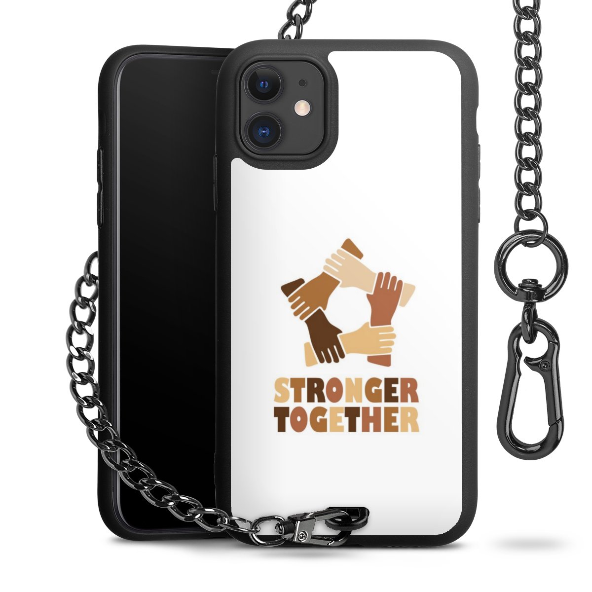 Die mattschwarze Silikon-Handyhülle besteht aus robustem TPU (thermoplastisches Polyurethan). Sie ist flexibel und schützt Dein Smartphone vor Stößen und Kratzern. Die Kette sowie der Karabinerhaken sind aus Metall in Gunmetal-Optik gefertigt. Für dieses Produkt kommen ausschließlich TÜV-geprüfte Materialien zum Einsatz.