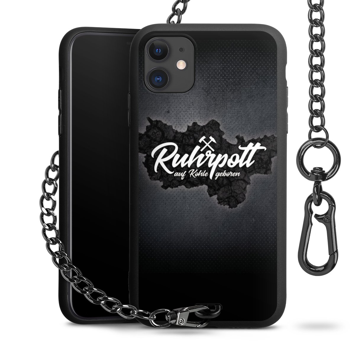 Die mattschwarze Silikon-Handyhülle besteht aus robustem TPU (thermoplastisches Polyurethan). Sie ist flexibel und schützt Dein Smartphone vor Stößen und Kratzern. Die Kette sowie der Karabinerhaken sind aus Metall in Gunmetal-Optik gefertigt. Für dieses Produkt kommen ausschließlich TÜV-geprüfte Materialien zum Einsatz.