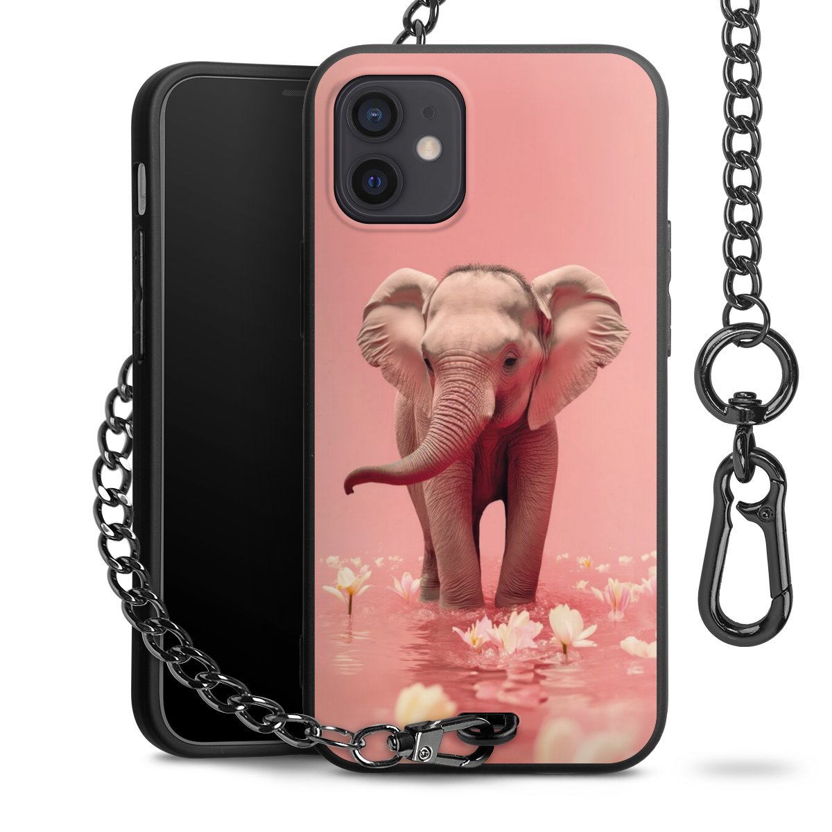 Die Handyhülle verfügt über eine mittig am unteren Rand platzierte Öse, an der die Metallkette stabil befestigt ist. Bestelle die Hülle einfach für Dein Smartphone-Modell, dann passt sie wie angegossen und Du brauchst sie bloß einmal anzudrücken. Handy in die Tasche, Karabiner an den Hosenbund – schon kann die Party starten.