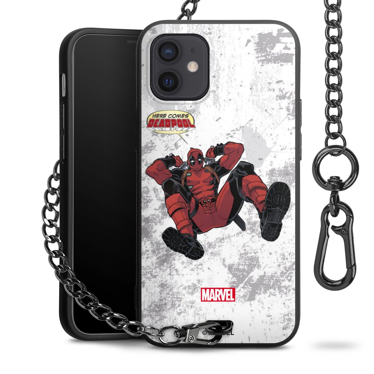 Die mattschwarze Silikon-Handyhülle besteht aus robustem TPU (thermoplastisches Polyurethan). Sie ist flexibel und schützt Dein Smartphone vor Stößen und Kratzern. Die Kette sowie der Karabinerhaken sind aus Metall in Gunmetal-Optik gefertigt. Für dieses Produkt kommen ausschließlich TÜV-geprüfte Materialien zum Einsatz.