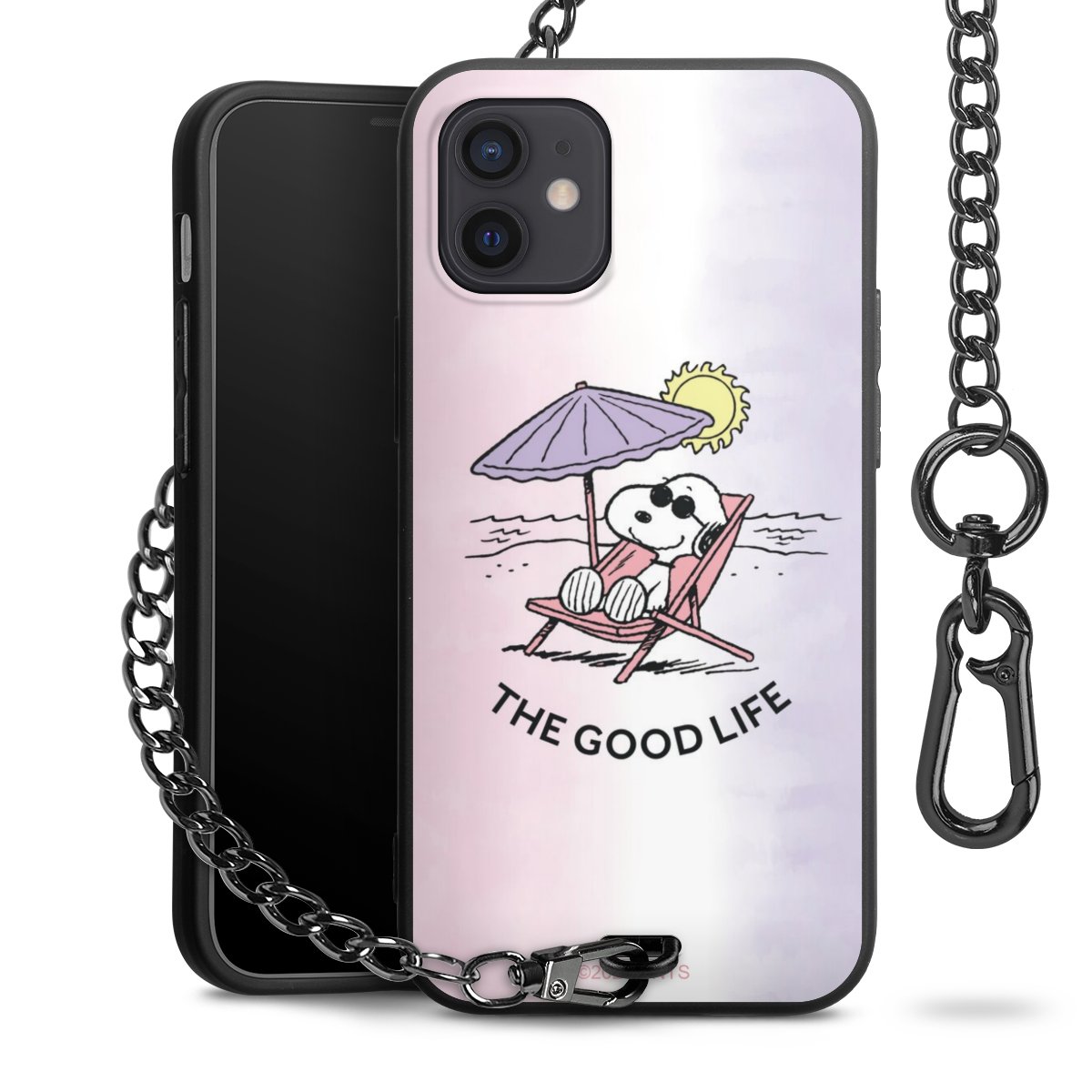 Die Handyhülle verfügt über eine mittig am unteren Rand platzierte Öse, an der die Metallkette stabil befestigt ist. Bestelle die Hülle einfach für Dein Smartphone-Modell, dann passt sie wie angegossen und Du brauchst sie bloß einmal anzudrücken. Handy in die Tasche, Karabiner an den Hosenbund – schon kann die Party starten.