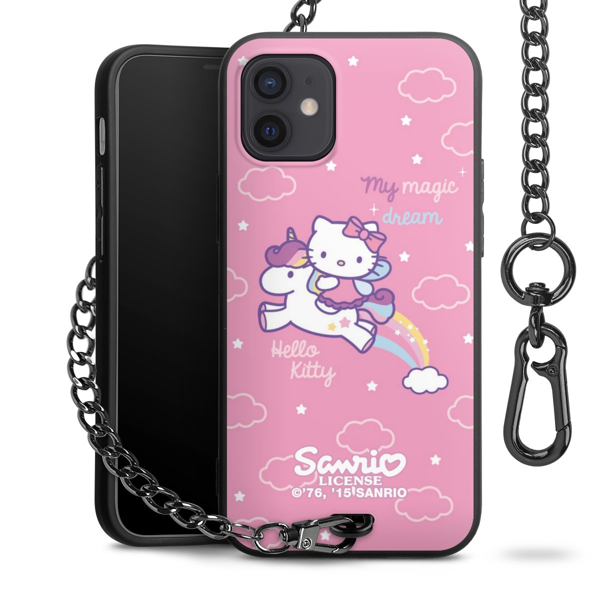 Die Handyhülle verfügt über eine mittig am unteren Rand platzierte Öse, an der die Metallkette stabil befestigt ist. Bestelle die Hülle einfach für Dein Smartphone-Modell, dann passt sie wie angegossen und Du brauchst sie bloß einmal anzudrücken. Handy in die Tasche, Karabiner an den Hosenbund – schon kann die Party starten.