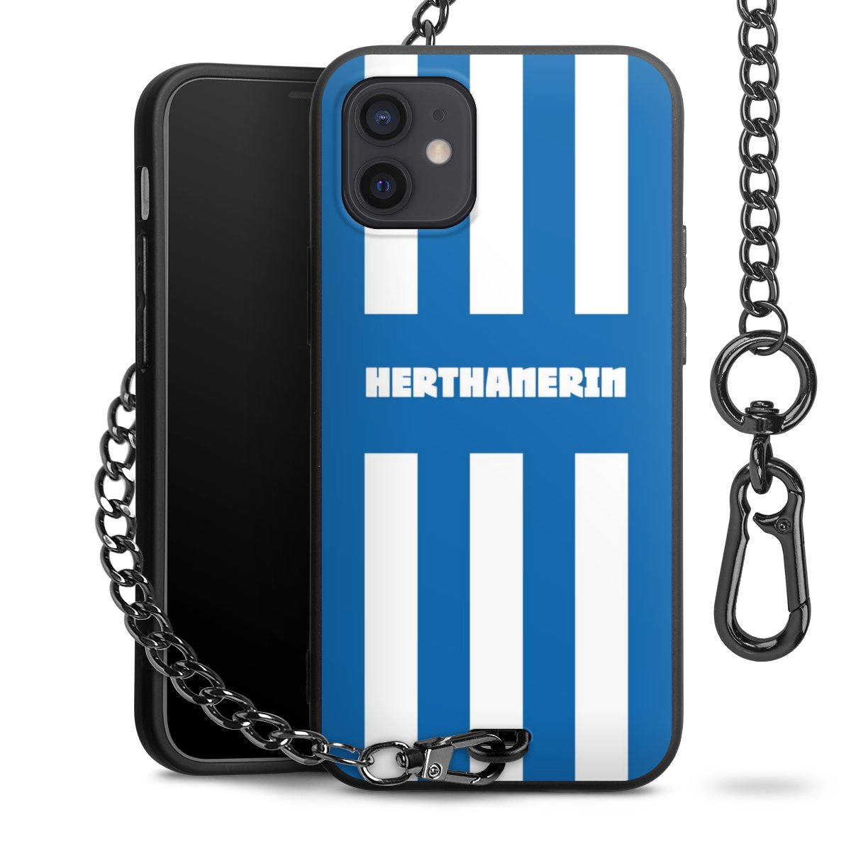 Die Handyhülle verfügt über eine mittig am unteren Rand platzierte Öse, an der die Metallkette stabil befestigt ist. Bestelle die Hülle einfach für Dein Smartphone-Modell, dann passt sie wie angegossen und Du brauchst sie bloß einmal anzudrücken. Handy in die Tasche, Karabiner an den Hosenbund – schon kann die Party starten.