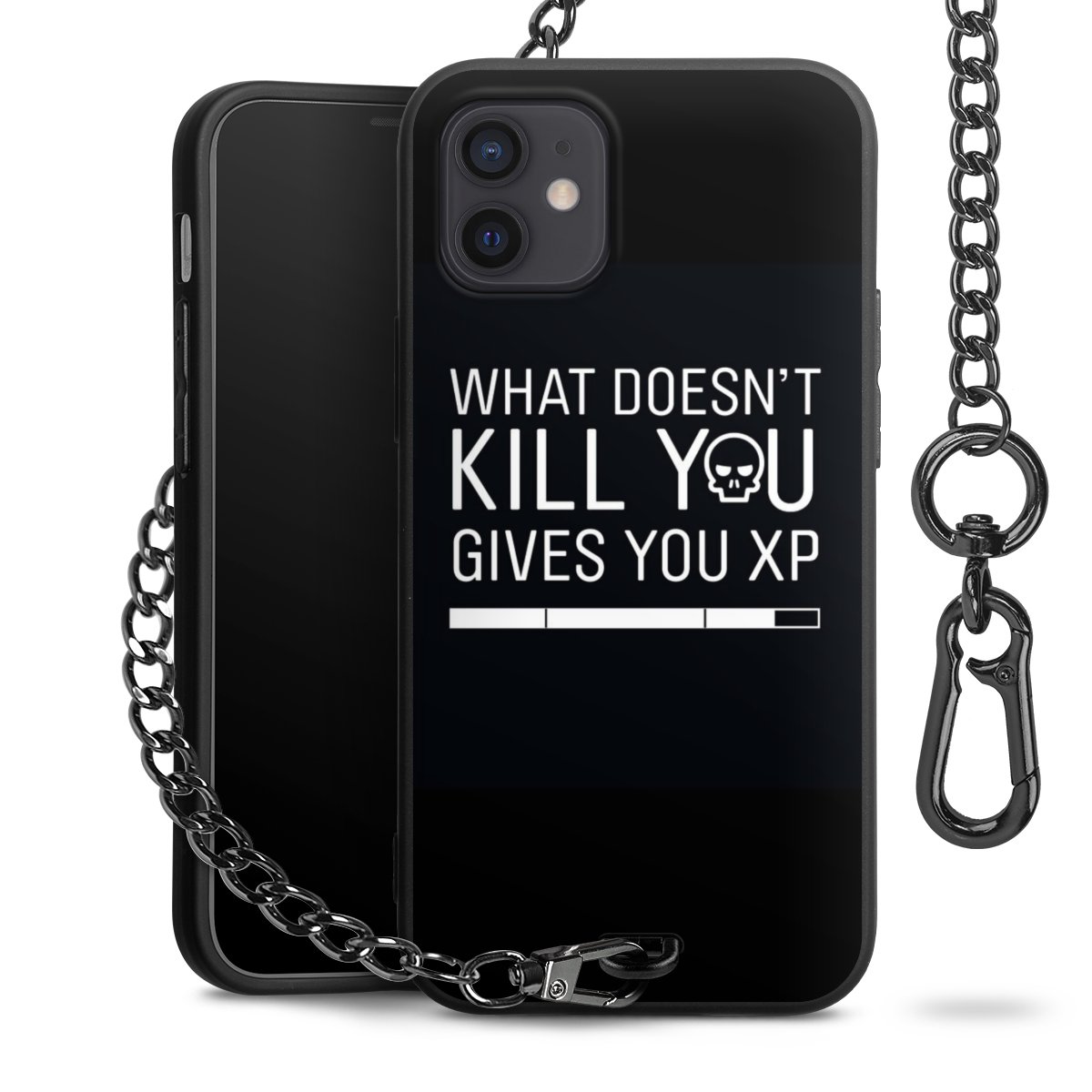 Die mattschwarze Silikon-Handyhülle besteht aus robustem TPU (thermoplastisches Polyurethan). Sie ist flexibel und schützt Dein Smartphone vor Stößen und Kratzern. Die Kette sowie der Karabinerhaken sind aus Metall in Gunmetal-Optik gefertigt. Für dieses Produkt kommen ausschließlich TÜV-geprüfte Materialien zum Einsatz.