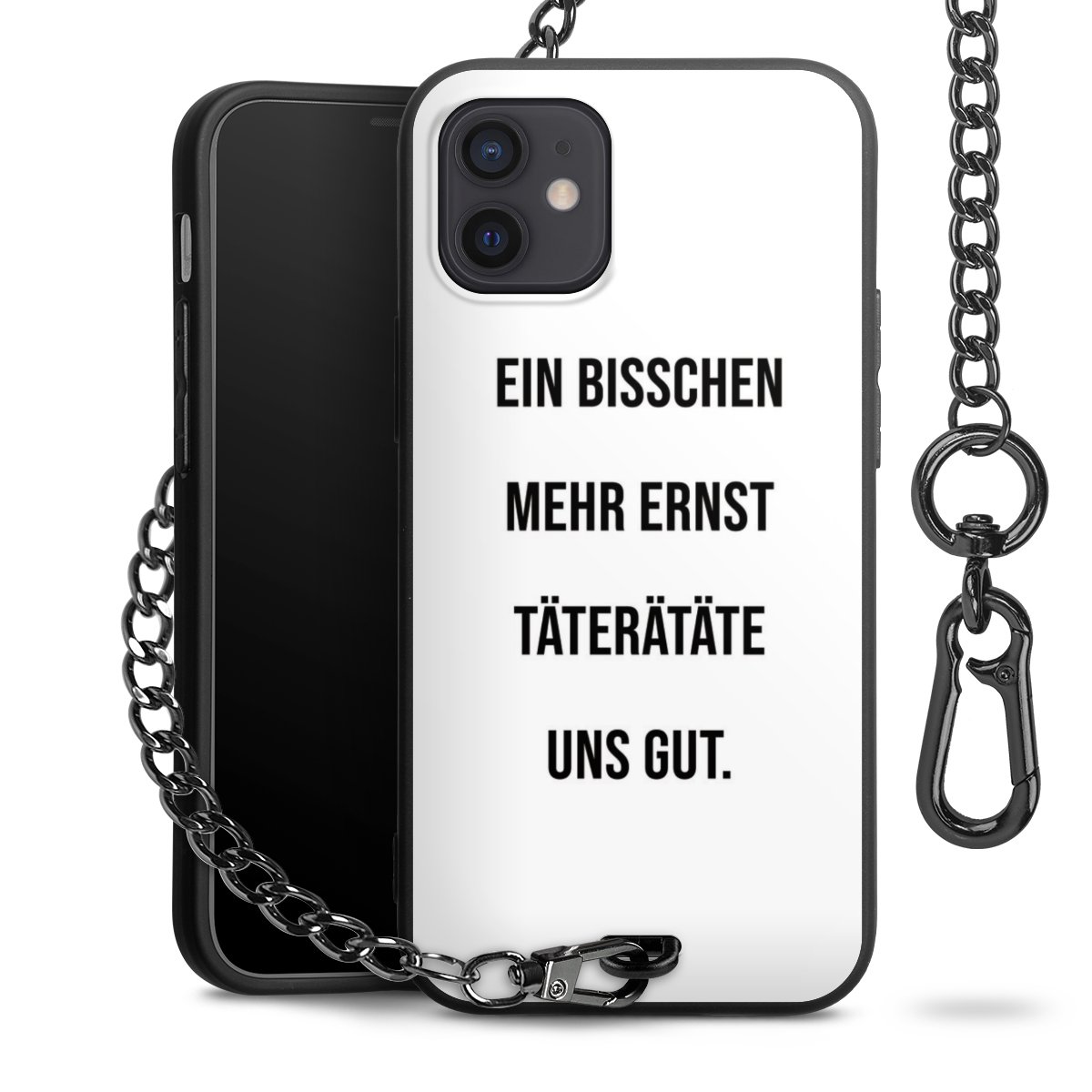 Die mattschwarze Silikon-Handyhülle besteht aus robustem TPU (thermoplastisches Polyurethan). Sie ist flexibel und schützt Dein Smartphone vor Stößen und Kratzern. Die Kette sowie der Karabinerhaken sind aus Metall in Gunmetal-Optik gefertigt. Für dieses Produkt kommen ausschließlich TÜV-geprüfte Materialien zum Einsatz.