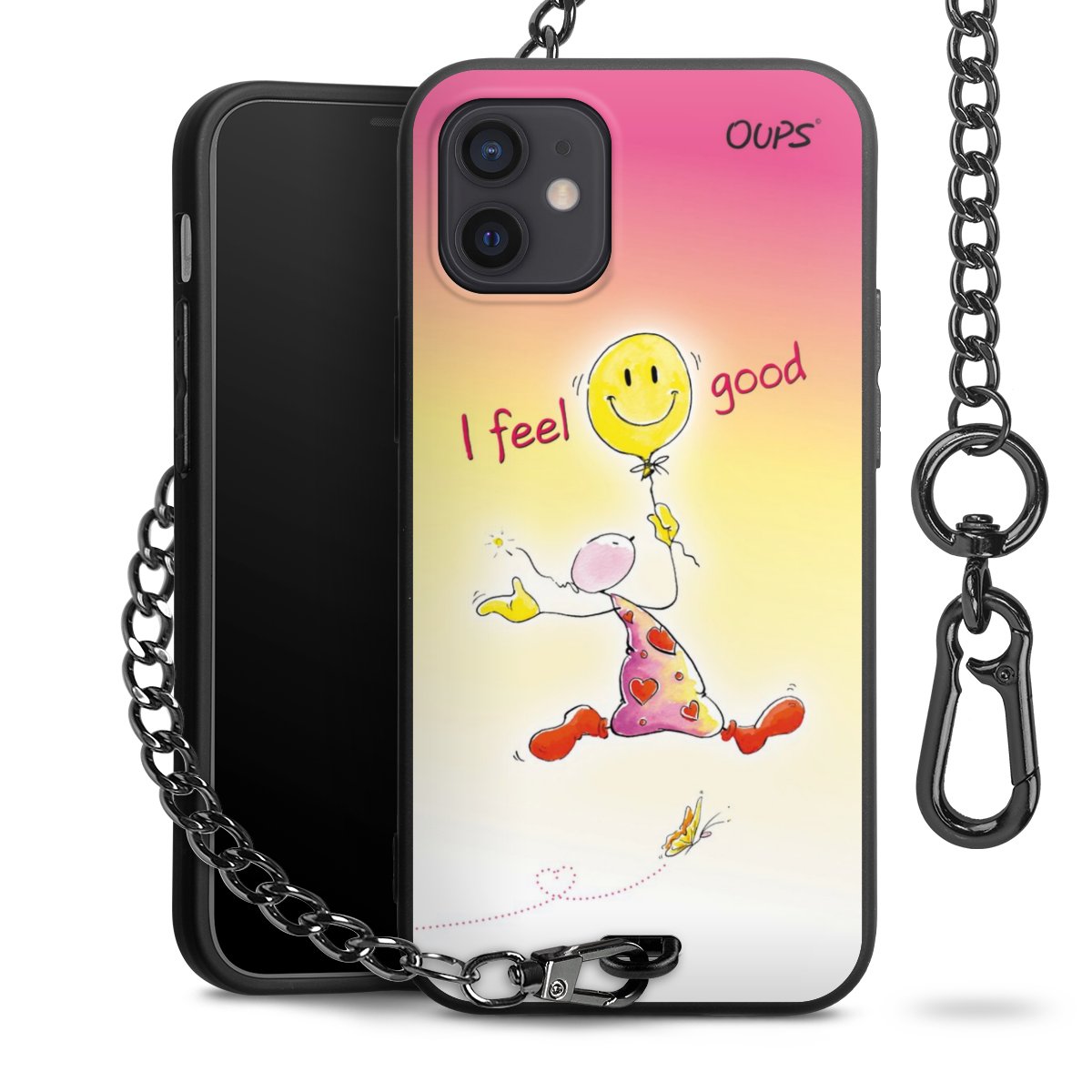Die Handyhülle verfügt über eine mittig am unteren Rand platzierte Öse, an der die Metallkette stabil befestigt ist. Bestelle die Hülle einfach für Dein Smartphone-Modell, dann passt sie wie angegossen und Du brauchst sie bloß einmal anzudrücken. Handy in die Tasche, Karabiner an den Hosenbund – schon kann die Party starten.