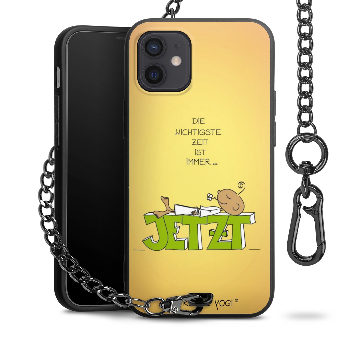 Die Handyhülle verfügt über eine mittig am unteren Rand platzierte Öse, an der die Metallkette stabil befestigt ist. Bestelle die Hülle einfach für Dein Smartphone-Modell, dann passt sie wie angegossen und Du brauchst sie bloß einmal anzudrücken. Handy in die Tasche, Karabiner an den Hosenbund – schon kann die Party starten.