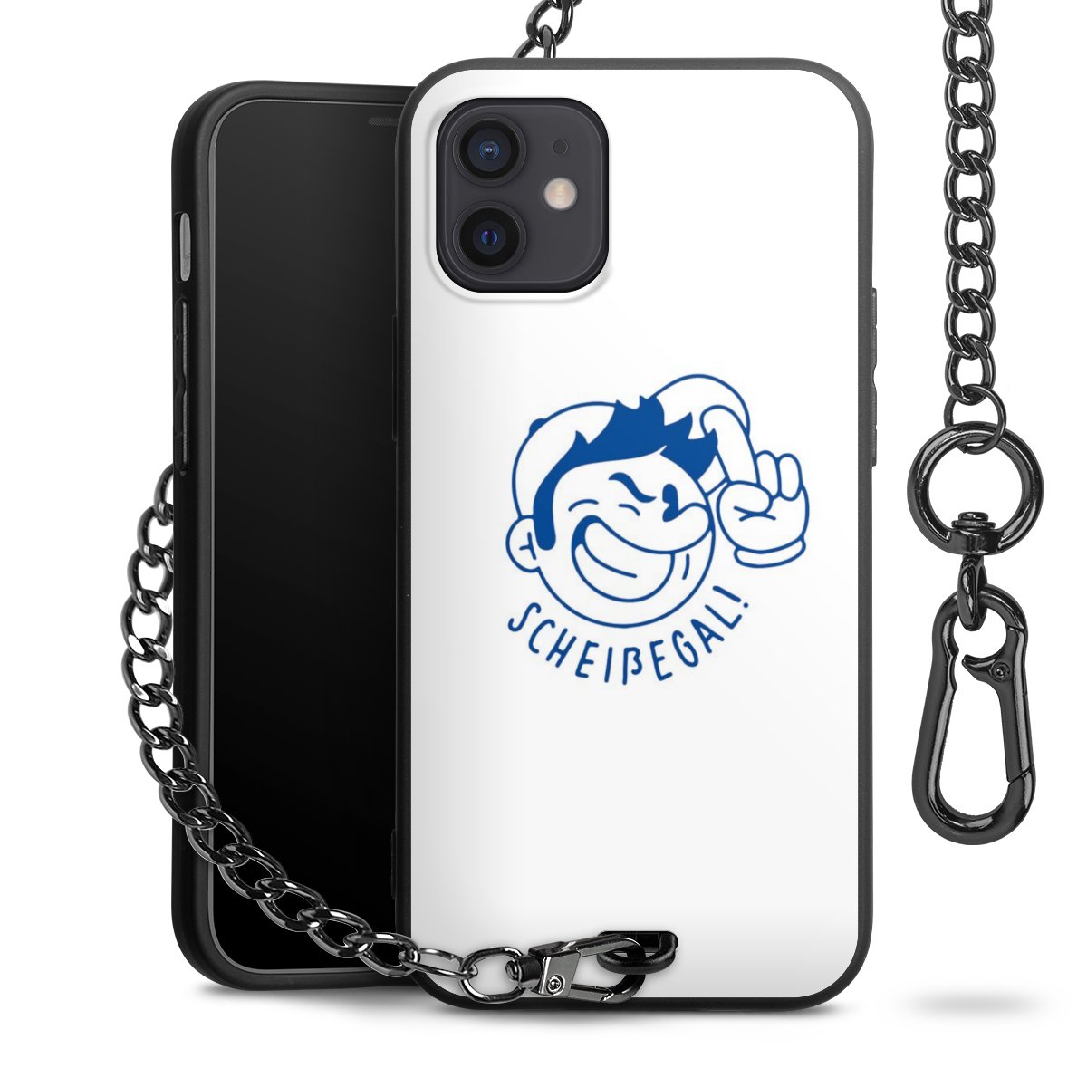 Die Handyhülle verfügt über eine mittig am unteren Rand platzierte Öse, an der die Metallkette stabil befestigt ist. Bestelle die Hülle einfach für Dein Smartphone-Modell, dann passt sie wie angegossen und Du brauchst sie bloß einmal anzudrücken. Handy in die Tasche, Karabiner an den Hosenbund – schon kann die Party starten.